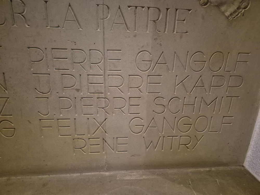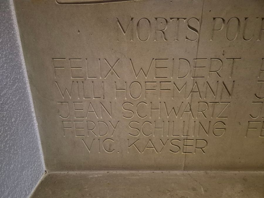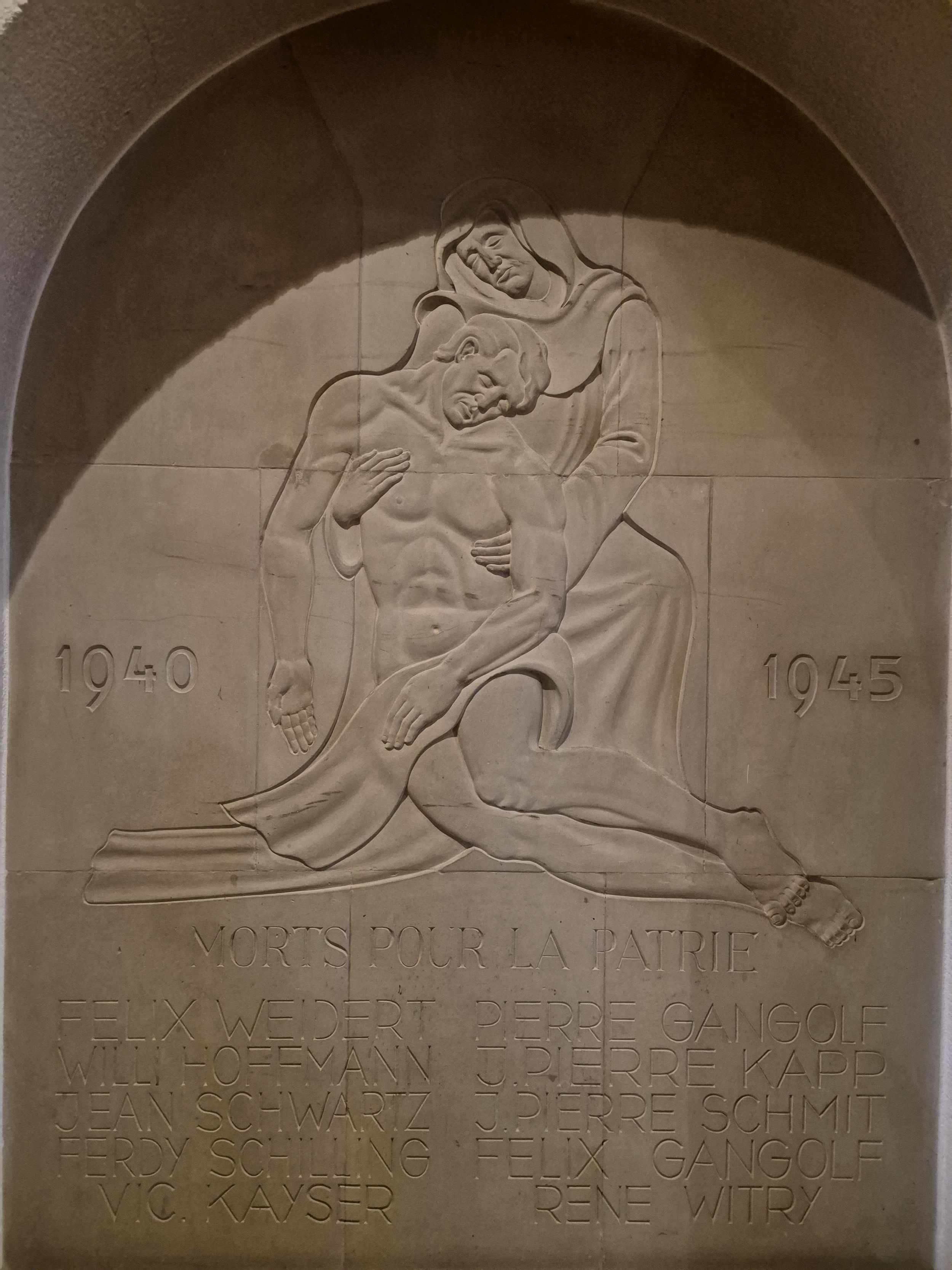 Unter dem Relief einer Pietà an der Inschrift „Morts pour la patrie“ stehen die Namen der Zwangsrekrutierten und Kazettler, die den Krieg nicht überlebt haben: