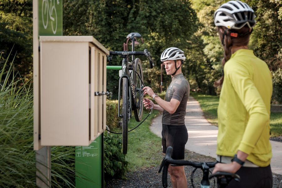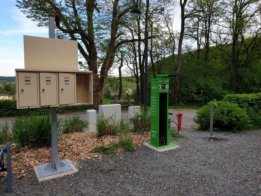 Die Lade &- Reparaturstation in der Nähe der Becher Gare bietet Lademöglichkeiten zum Aufladen von E-Bikes sowie verschiedene Werkzeuge zum Reparieren von Fahrrädern. Eine Luftpumpe steht zum Aufpumpen von Rädern, Kinderwagen und Rollstühlen zur Verfügung.