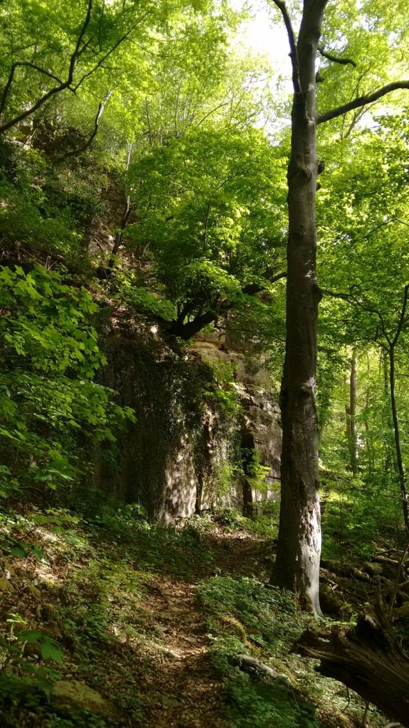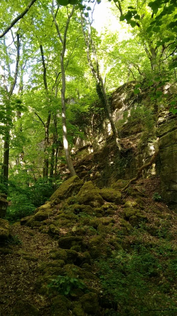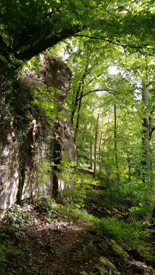 Im Nordwesten hat das Wasser der Sauer durch Erosion am Hangfuß einen Erdrutsch verursacht. Im unteren Teil des bewaldeten Hanges finden sich Mergel, ein Gestein, das aus einer Mischung von Tonmineralen und Dolomit besteht. In den Mergeln kommt Gips vor, der der hier in früherer Zeit abgebaut wurde. Der obere Teil des Hanges wird von Dolomit gebildet, der in einer steilen Felswand aufragt. Vor der Felswand liegen zahlreiche Dolomitblöcke, die durch die Rutschung von der Felswand gelöst wurden. Eine der senkrechten Klüfte in der Dolomitwand, „Kimmhaischen“ genannt, führt zu einer Grotte, die einer Legende nach vom „Kimmfrächen“ bewohnt wird. Diese gespensterhafte Frau soll emsig mit einer Spindel spinnen, und es heißt, dass der, der mit dem Kopf am Felsen lauscht, sie dabei hören könne. Im Frühling und Sommer kann es sein, dass die Geisterfrau ihr unterirdisches Gemach verlässt, sich mit ihrer Spindel auf den Scheitel des Kimmhaischens setzt und beim Spinnen ein uraltes Lied singt, das manchmal zu hören ist.