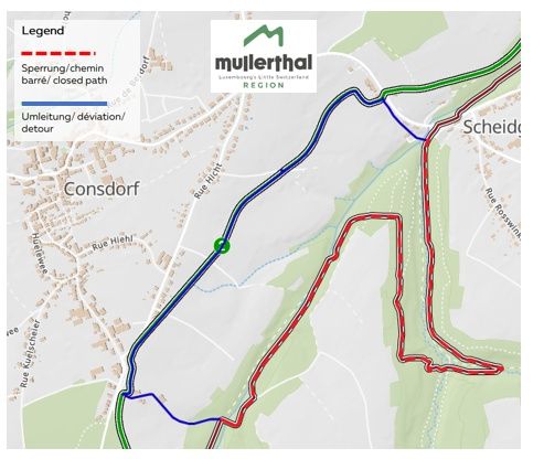 Um Consdorf herum verläuft der Mullerthal Trail durch einen wunderschönen Landschaftsabschnitt, in dem sich Wald, Felsen und offenes Gelände abwechseln. Danach führt der Weg durch die Ortschaft Scheidgen und schließlich zurück nach Echternach. In Scheidgen und Echternach findet man verschiedene Einkehrmöglichkeiten.