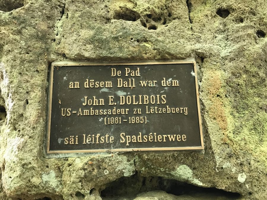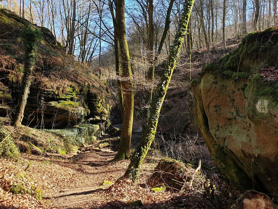 Der Weg verläuft zunächst am Bach entlang und durch die Felsenlandschaft von Berdorf. Die Huel Lee erreichen Sie nur, wenn Sie nach ca. 800 m einen Abstecher (ca. 150 m lang) nach links machen. Die Huel Lee ist eine von Menschenhand geformte Höhle. Dort wurden früher Mühlsteine aus den Felsen herausgebrochen.