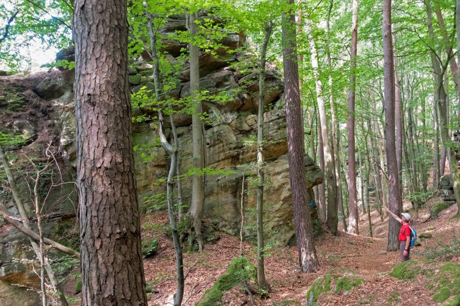 Auf kleinem Raum bietet sich hier ein Highlight nach dem anderen: Mächtige Felsblöcke wie der Päerdskapp (Pferdekopf), kuriose Erosionsformen und klaffende Felsspalten wie die Schelmelee - eine frühere Behausung - beeindrucken auf diesem Wanderweg durch ihre erstaunliche Vielfalt und Erscheinungsform. Der Weg ist aufgrund schmaler Passagen und felsigem Untergrund einer der anspruchsvolleren Wanderwege in Consdorf und führt ausschließlich durch den Wald.