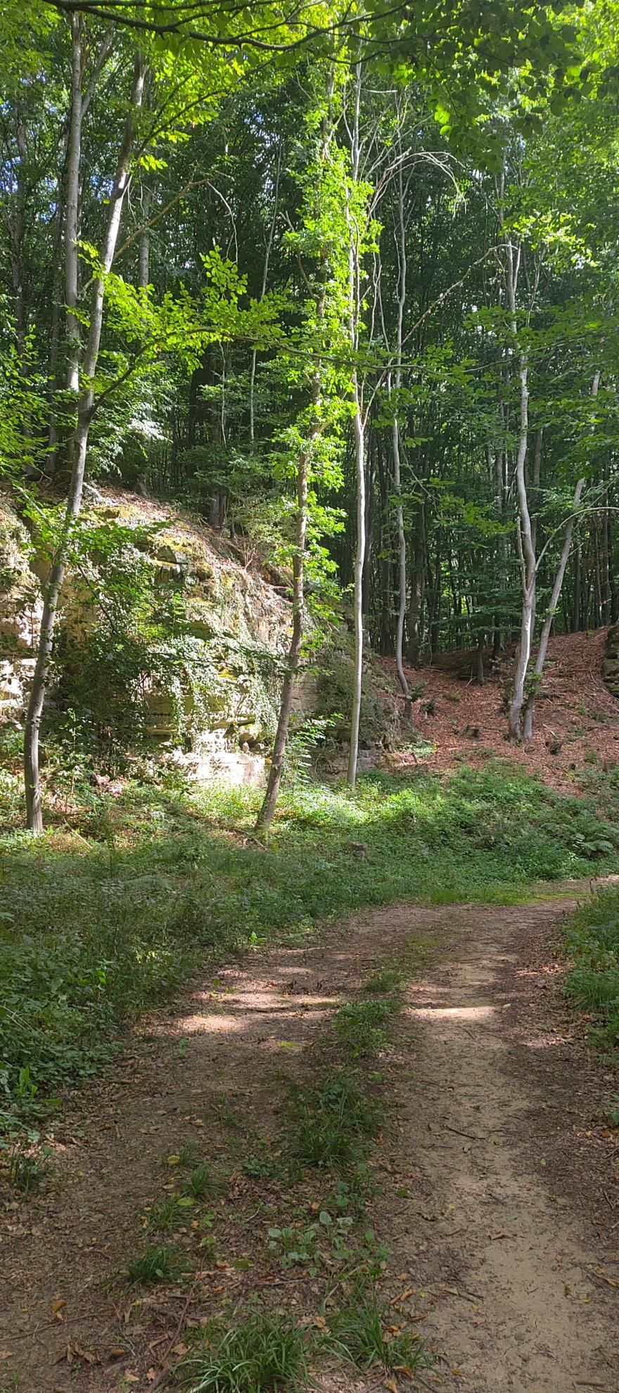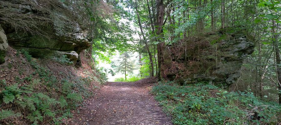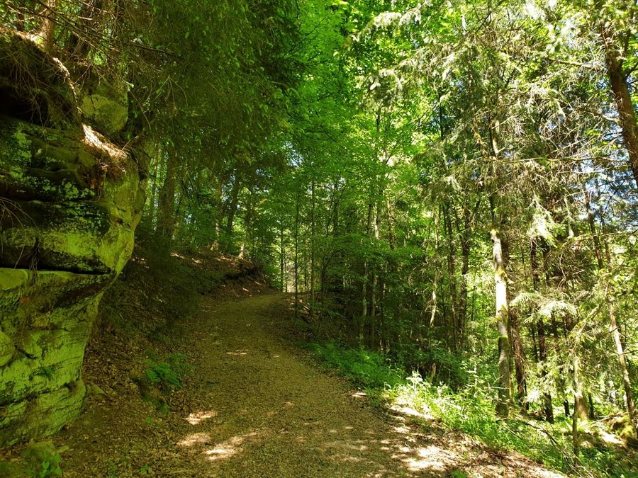 Diese Wanderung führt zunächst durch den Wald hinab ins Tal Richtung Fischbach. Der Abstieg verläuft über einen breiten Weg, gesäumt von Felsen. Unten angekommen, steigt der Weg sanft und kurvenreich wieder an. Anschließend geht es über einen asphaltierten Weg über die Anhöhe zurück zum Ausgangspunkt.