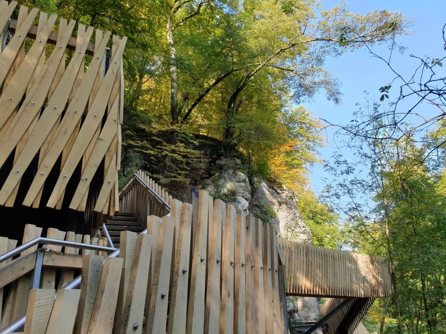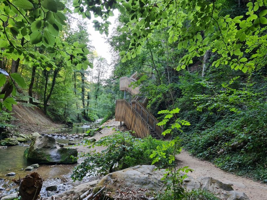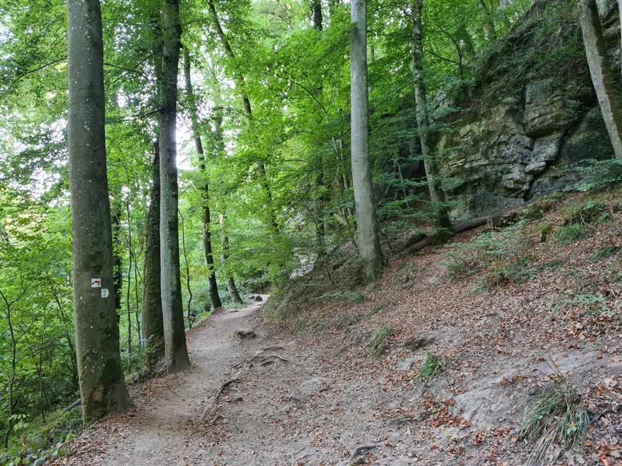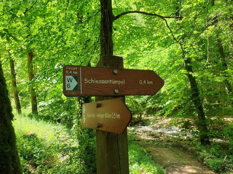 Dieser Wanderweg führt zum Wahrzeichen der Region Müllerthal - Kleine Luxemburger Schweiz: Der Schiessentümpel. Er ist das beliebteste Ausflugsziel in der Region und kann am besten zu Fuß erreicht werden. Hinter dem Schiessentümpel schließt sich eine moderne Treppenkonstruktion an, die erbaut wurde um den Schiessentümpel nach den starken Unwettern 2018 wieder zugänglich zu machen.