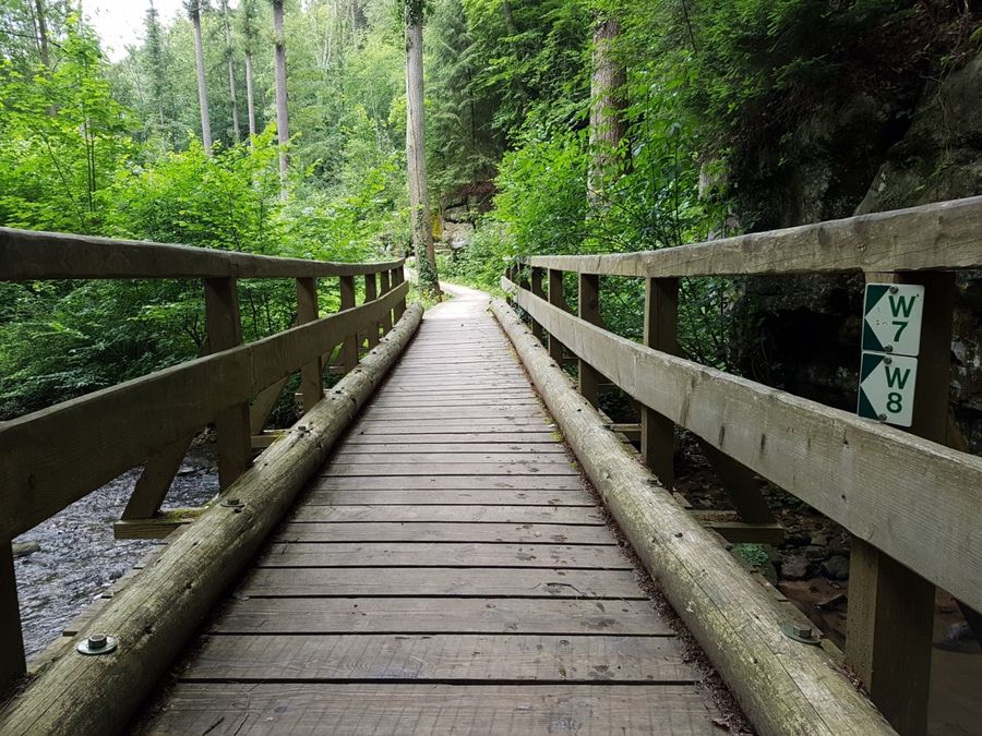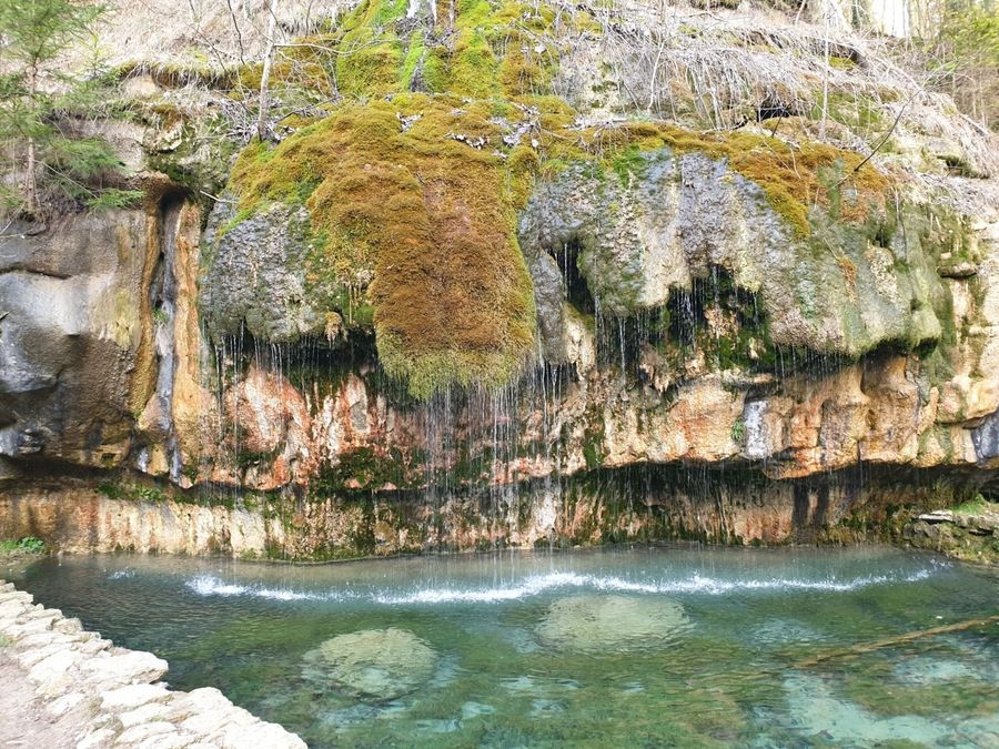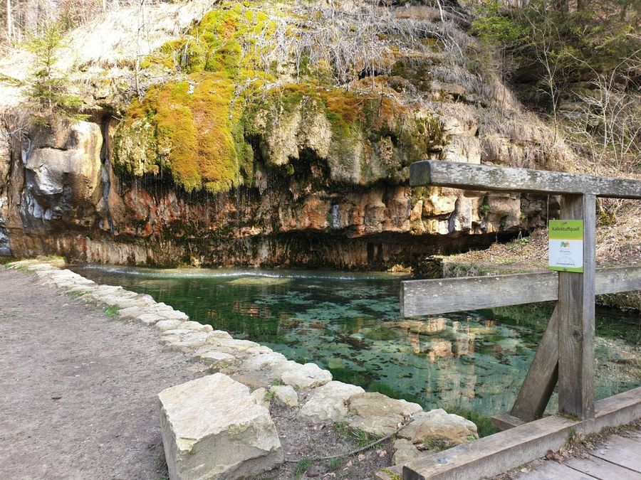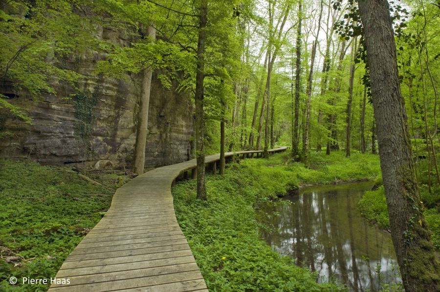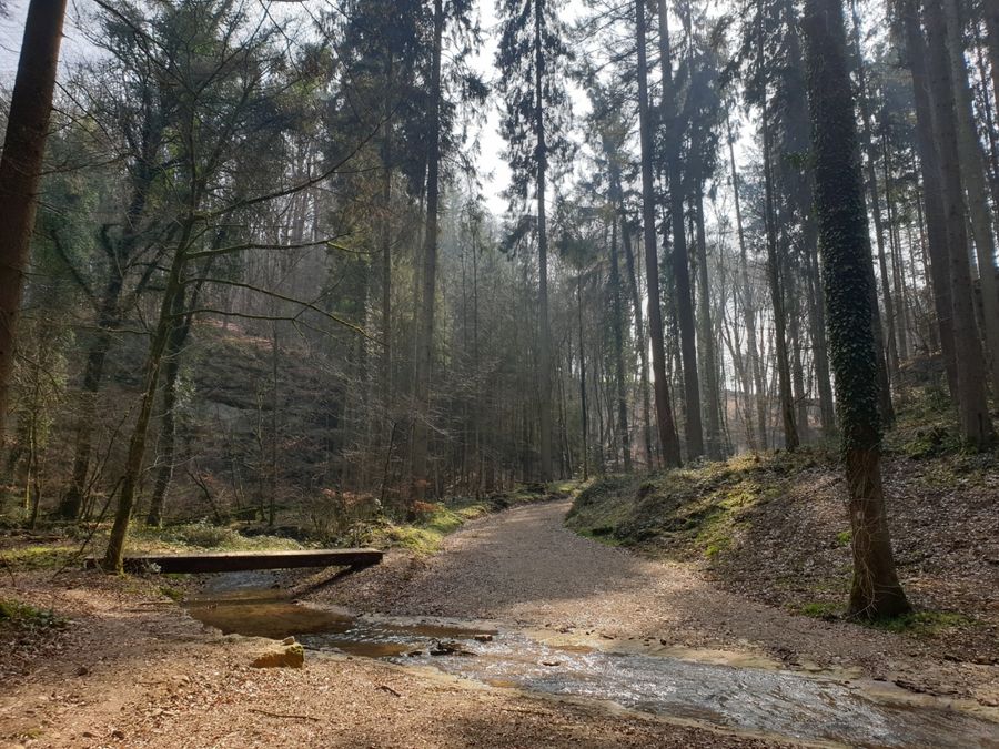 Über einen Holzsteg gelangen Sie zur beeindruckenden Kalktuffquelle, wo ein Wasserlauf über den Felsvorsprung leise in einen glasklaren Teich rieselt. Der krönende Abschluss macht das Aushängeschild der Region Mullerthal – Klein Luxemburger Schweiz - der Schiessentümpel mit seiner malerischen Steinbrücke über dem kleinen Wasserfall.
