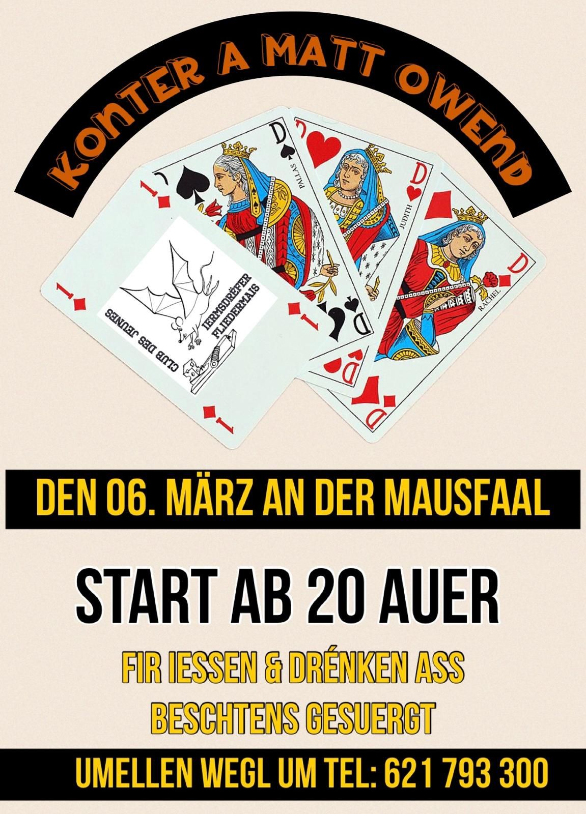 Wann? Freitag 06.03.202620:00 - 23:45 Uhr Konter a Matt Owend Wo? GILSDUERFERSTROOSS 41, L-9366 ERMSDORF Andere Konter a Matt Owend.Kaartespill.©echo.luDie nächsten TermineFreitag 06.03.202620:00 - 23:45 Uhr