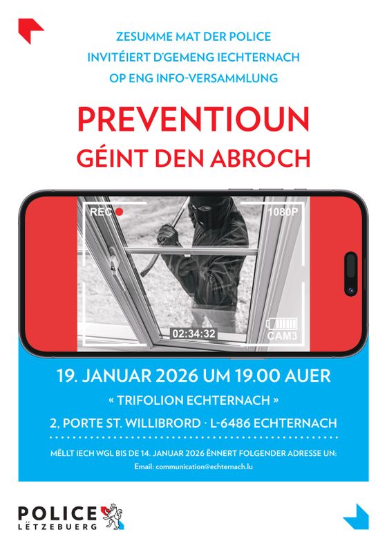 Melden Sie sich bitte unter Angabe der gewünschten Sprache (Luxemburgisch, Französisch, Englisch) unter 72 92 22-1 oder reception@echternach.lu an. Wir freuen uns auf Ihre Teilnahme!