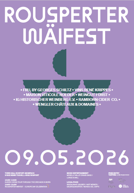 The cultivation and sale of wine have a long tradition on both sides of Sauer valley. The former monastery in Echternach was heavily involved in winegrowing on the Sauer. Not surprisingly, wine growing has also been practiced for a long time in Rosport. Henri Tudor’s brother Hubert was already enthusiastic about viticulture and tried his hand at different types of vines. On Europe Day 9 May 2026, wine winegrowers from both sides of the Sauer Valley and traders will present their unique local products in Rosport near the town hall.