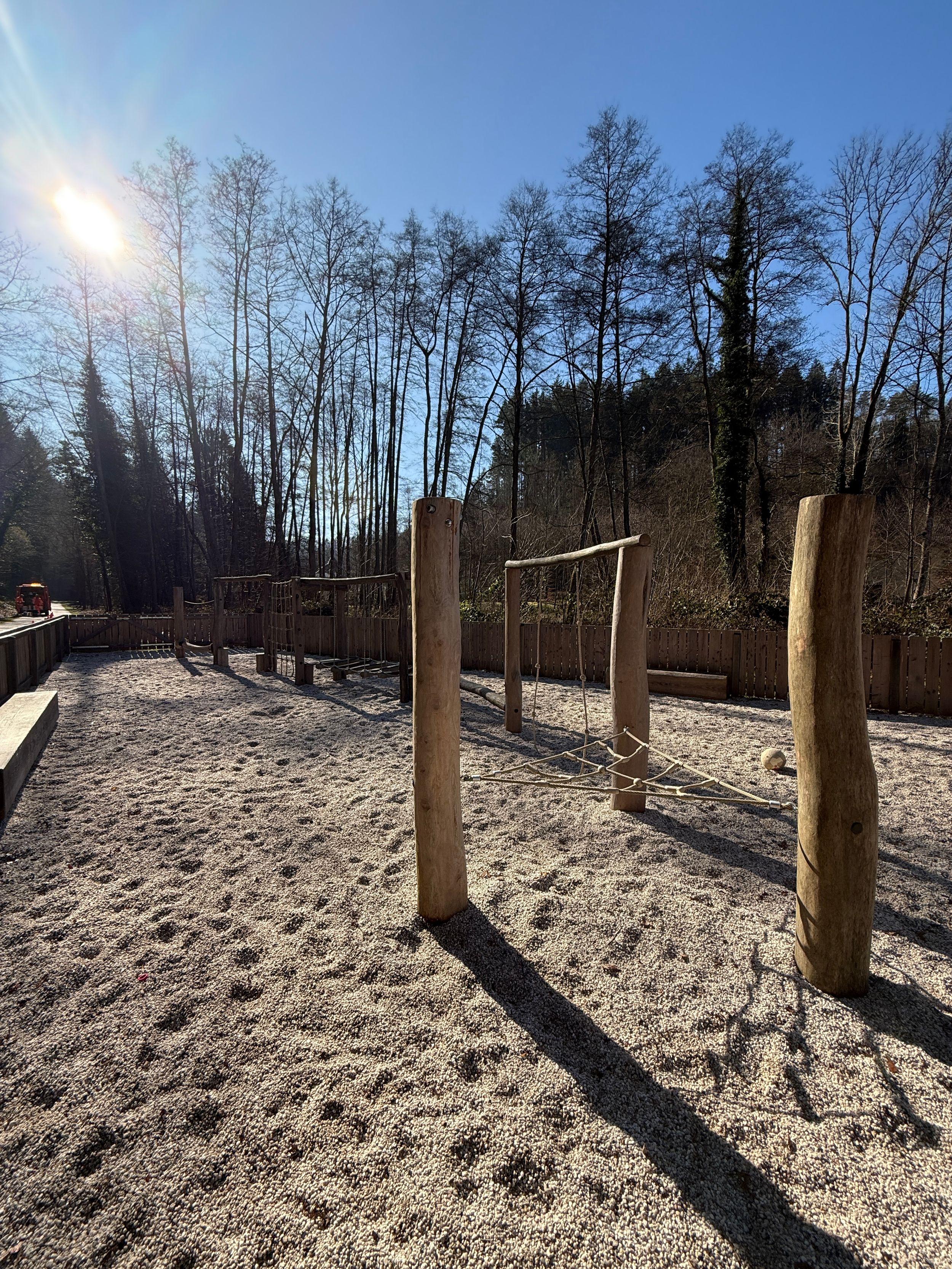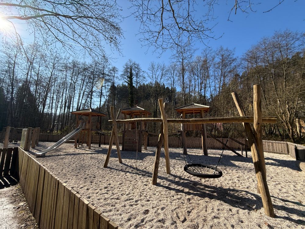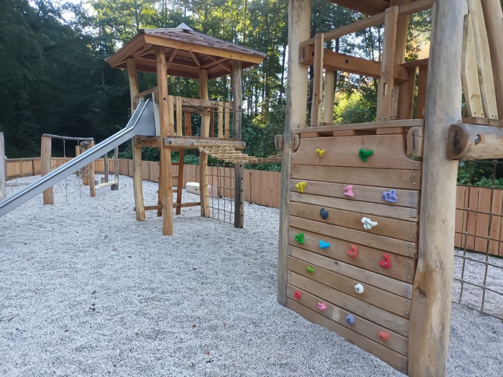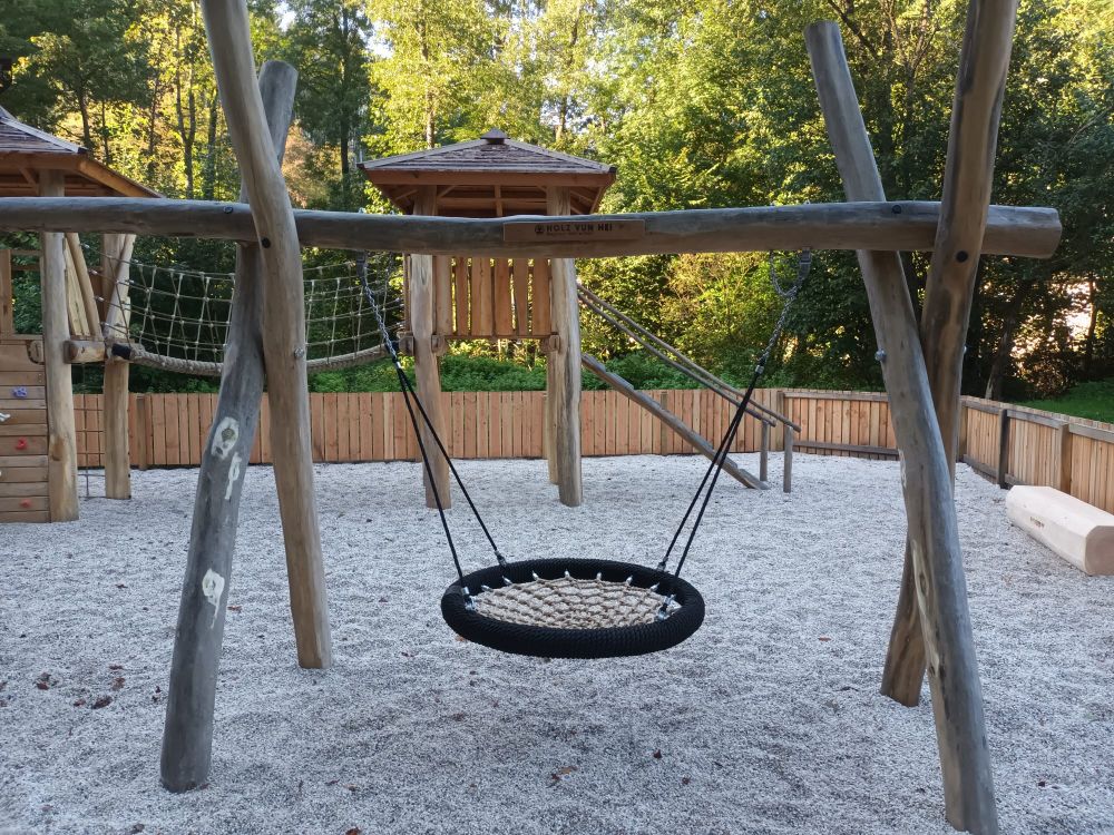 Grand terrain de jeux Martbusch. Aire de jeux ombragée en forêt pour petits et grands explorateurs.