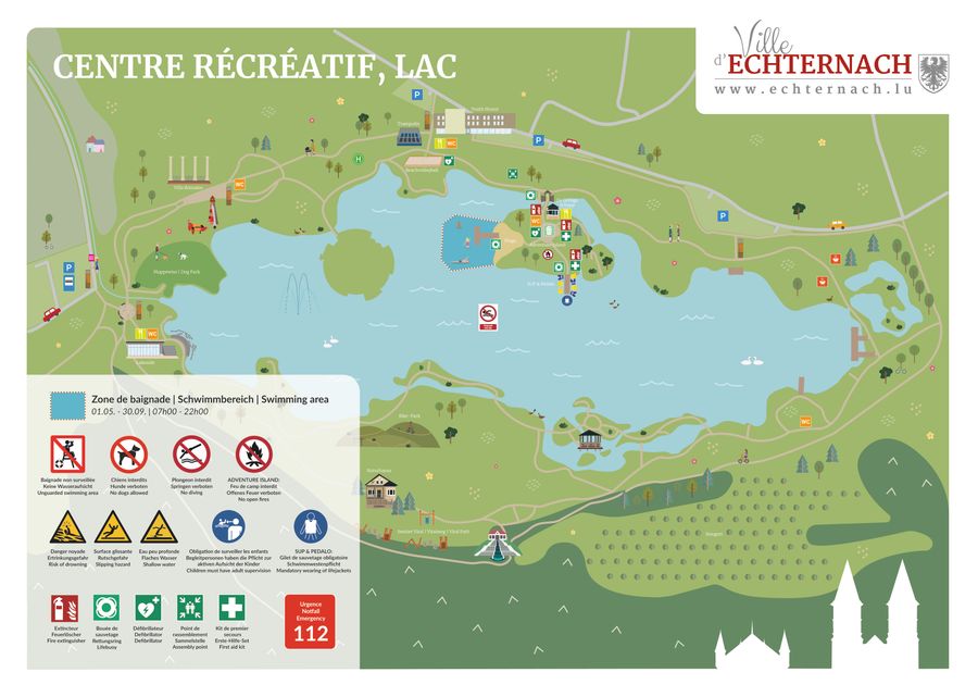 Attention : la baignade dans le lac d'Echternach est à vos risques et périls. Il n'y a pas de surveillance de la baignade sur place.