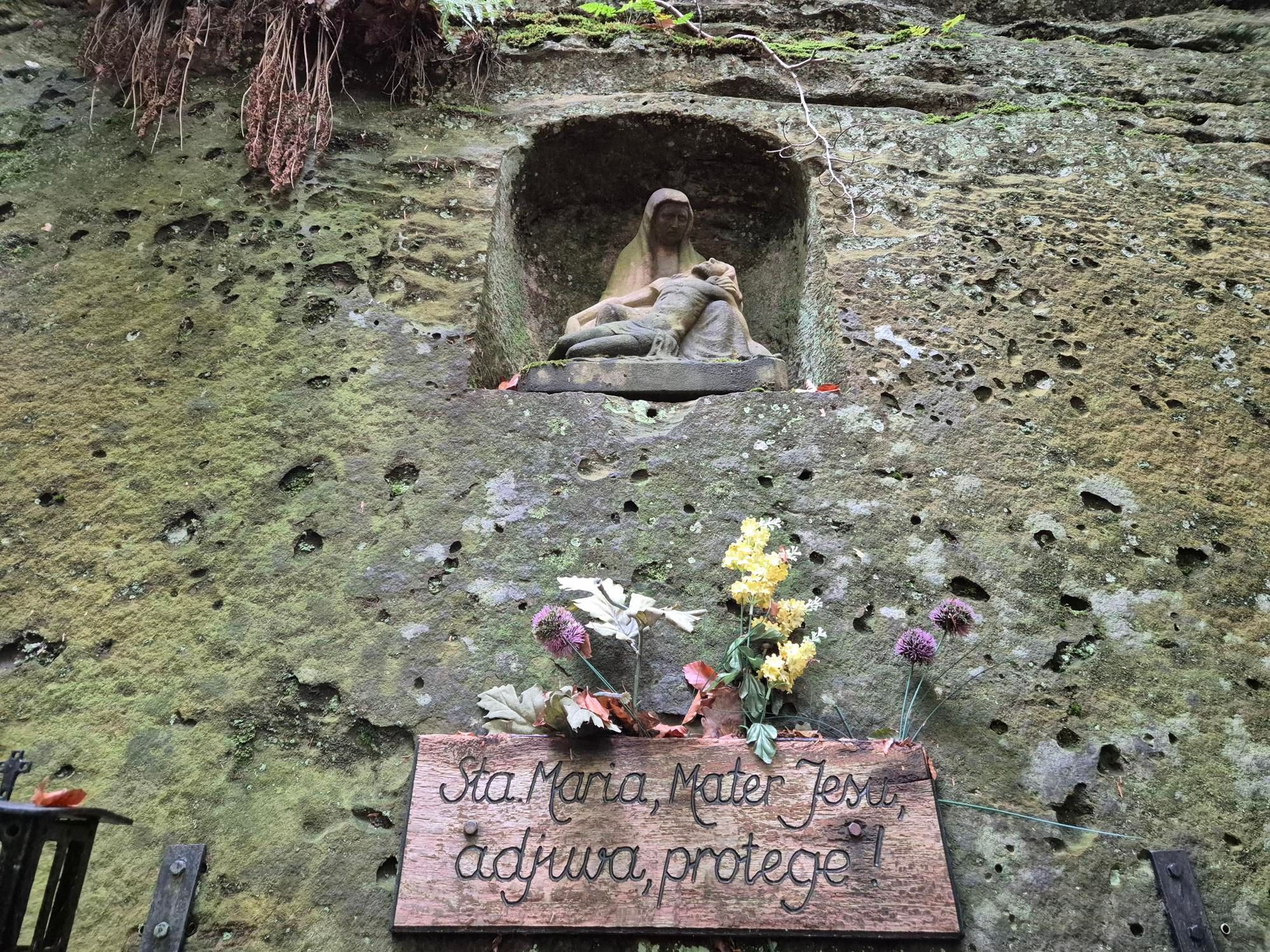 Ils choisirent un lieu près de l’ancienne “Bildcheslay”, ce qui explique le nom “bäim Bildchen”. Les deux hommes ont ensuite creusé la niche dans la roche où se trouve aujourd’hui la Mater Dolorosa. Pendant les années de guerre, de nombreux habitants de Berdorf venaient ici pour trouver réconfort et force. Jusqu’aux années 1990, les paroissiens de Berdorf faisaient un pèlerinage en procession vers cet endroit.