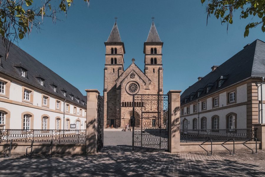Au pied de l’église dédiée aux apôtres Pierre et Paul, des sculptures en blocs de pierre décorés d’entrelacés celtes rappellent les 1300 ans d’histoire d’Echternach. L'église Saint-Pierre et Paul est située sur un site archéologique gallo-romain. Lors de l’époque mérovingienne, en 698, un petit hospice et deux chapelles se trouvant à cet endroit furent données à St. Willibrord par l'abbesse Irmina d’Oeren près de Trèves. Au 10ème et 12ème siècle fut entamée la construction d'une église à trois nefs, qui fut munie d’éléments gothiques en 1480. Cette église décorée de fresques fut reconstruite et restaurée à plusieurs reprises.