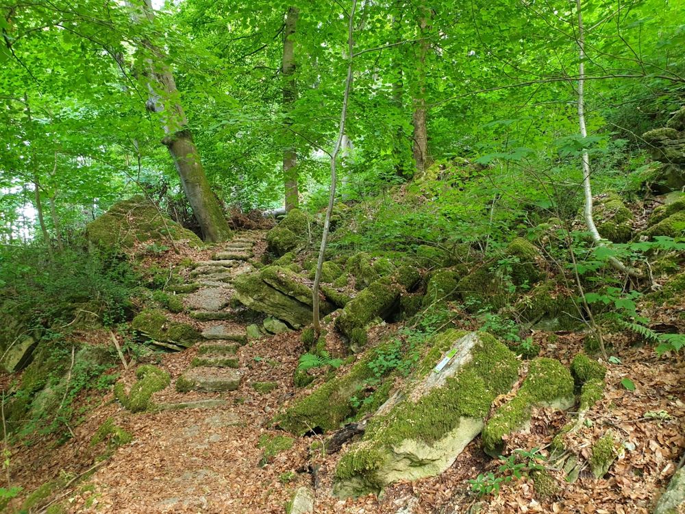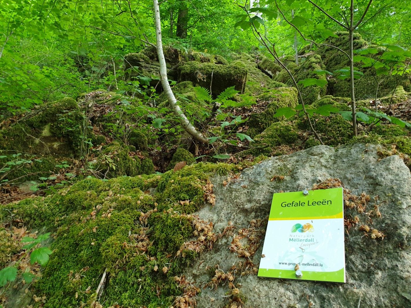 Couvertes de mousse, de lichens et de fougères, les «Gefale Leeën» - «rochers tombés» - bordent le chemin. Les roches sont faites de dolomite et sont tombées des grandes parois rocheuses. L'eau coule à travers les fentes de la dolomite et s'accumule sur les marnes sous-jacentes, une roche riche en argile. Pendant longtemps, les parois rocheuses de la dolomite glissent le long des marnes ramollies jusqu'à la vallée. D'énormes chutes de pierres comme le «Gefale Leeën» peuvent se produire sur les parois rocheuses de la dolomite, mais elles sont rares. Les chutes sont généralement favorisées par l'érosion intense des pentes de la Sûre. Sur le relief agité autour des blocs de pierre partiellement envahis, une forêt de canyon s'est développée. Une forêt de canyons est composée de tilleuls, d'érables, de hêtres et d'ormes et pousse sur des pentes abruptes où la couche supérieure de sol et de roche n'est pas stable.