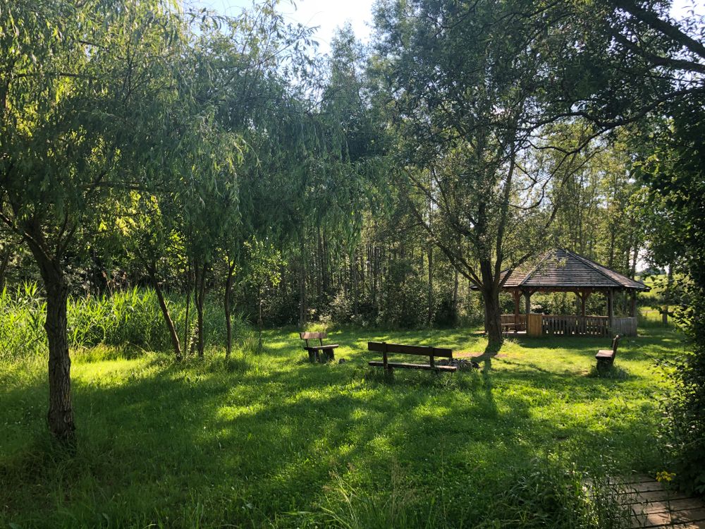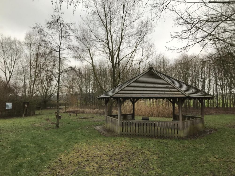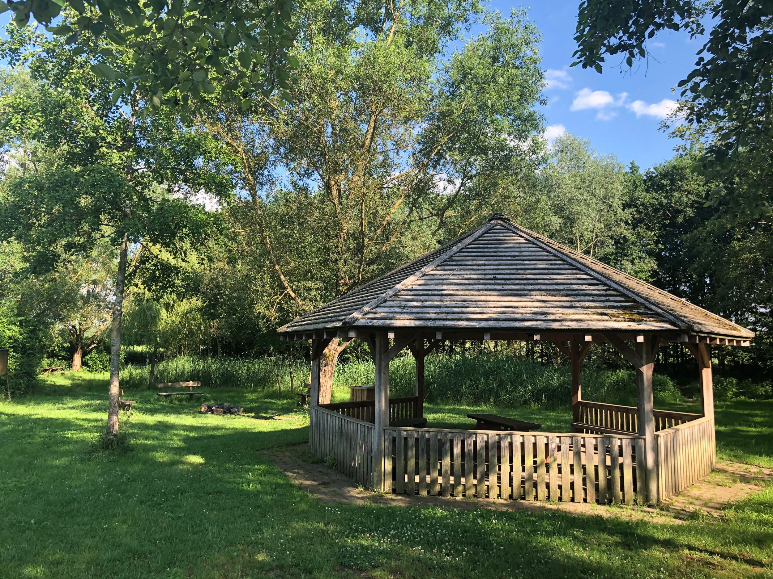 Aire de barbecue proche de la nature avec cabane et possibilités de s'asseoir.