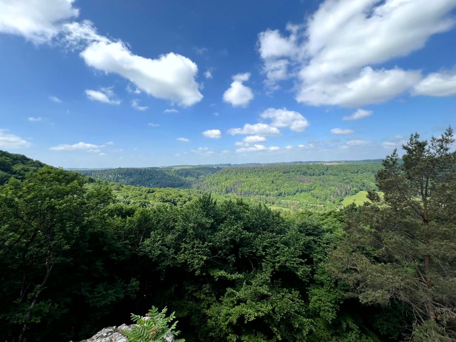Érigée en 2025, la plateforme panoramique Ruetsbech offre une vue étendue sur la vallée de la Ernz Noire et les paysages caractéristiques de la Région Mullerthal.