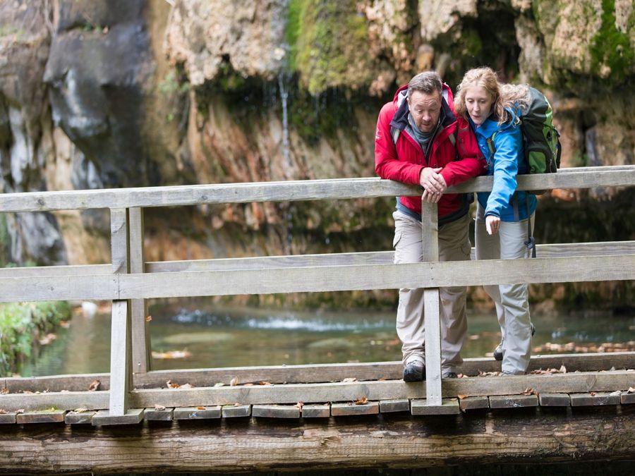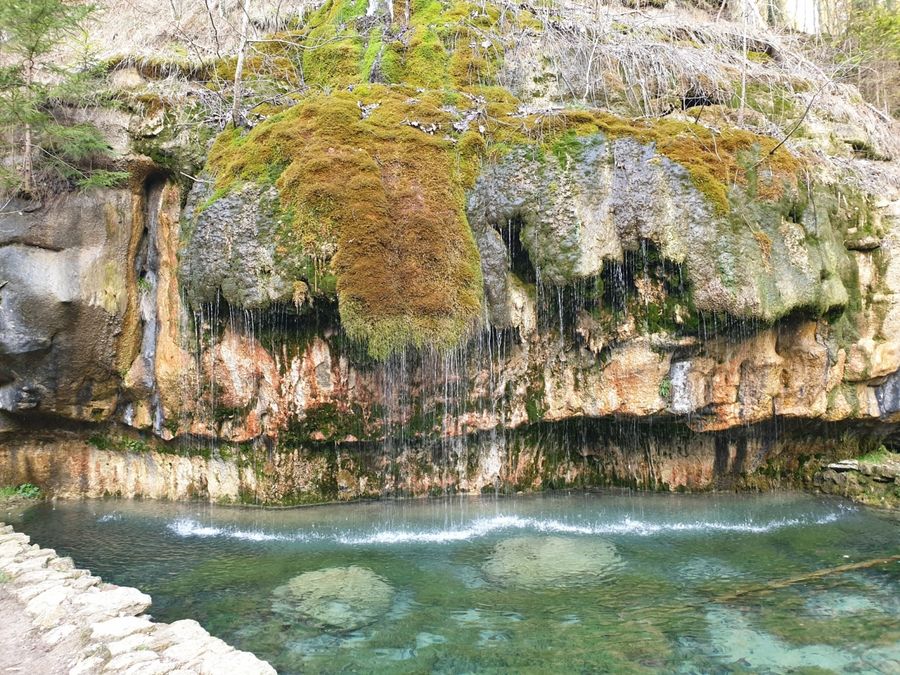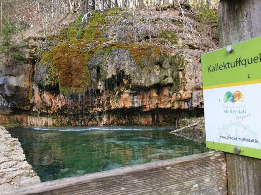 Au site de la source de tuffeau dans la vallée de l’Ernz Noire de l’eau calcaire très claire coule d’un rocher dans un petit bassin. Le flamboiement des couleurs de l’eau et des roches ainsi que la diversité des mousses sont particulièrement impressionnants.