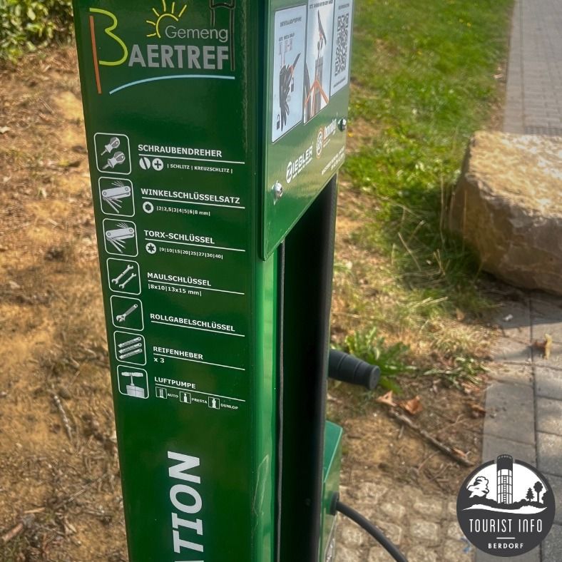 La station de réparation pour vélos à Berdorf propose des outils pour réparer les vélos ainsi qu'une pompe à air pour gonfler les vélos comme les poussettes et les chaises roulantes.