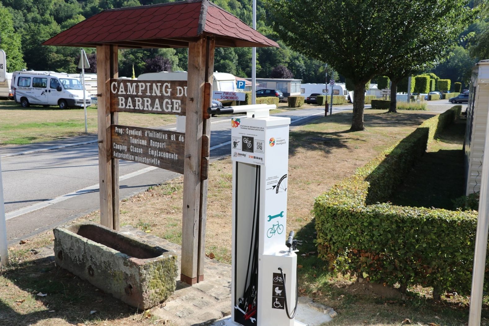 Le Camping du Barrage propose une station de réparation avec différents outils pour réparer les vélos ainsi qu'une pompe à air pour gonfler les roues, les poussettes et les fauteuils roulants.
