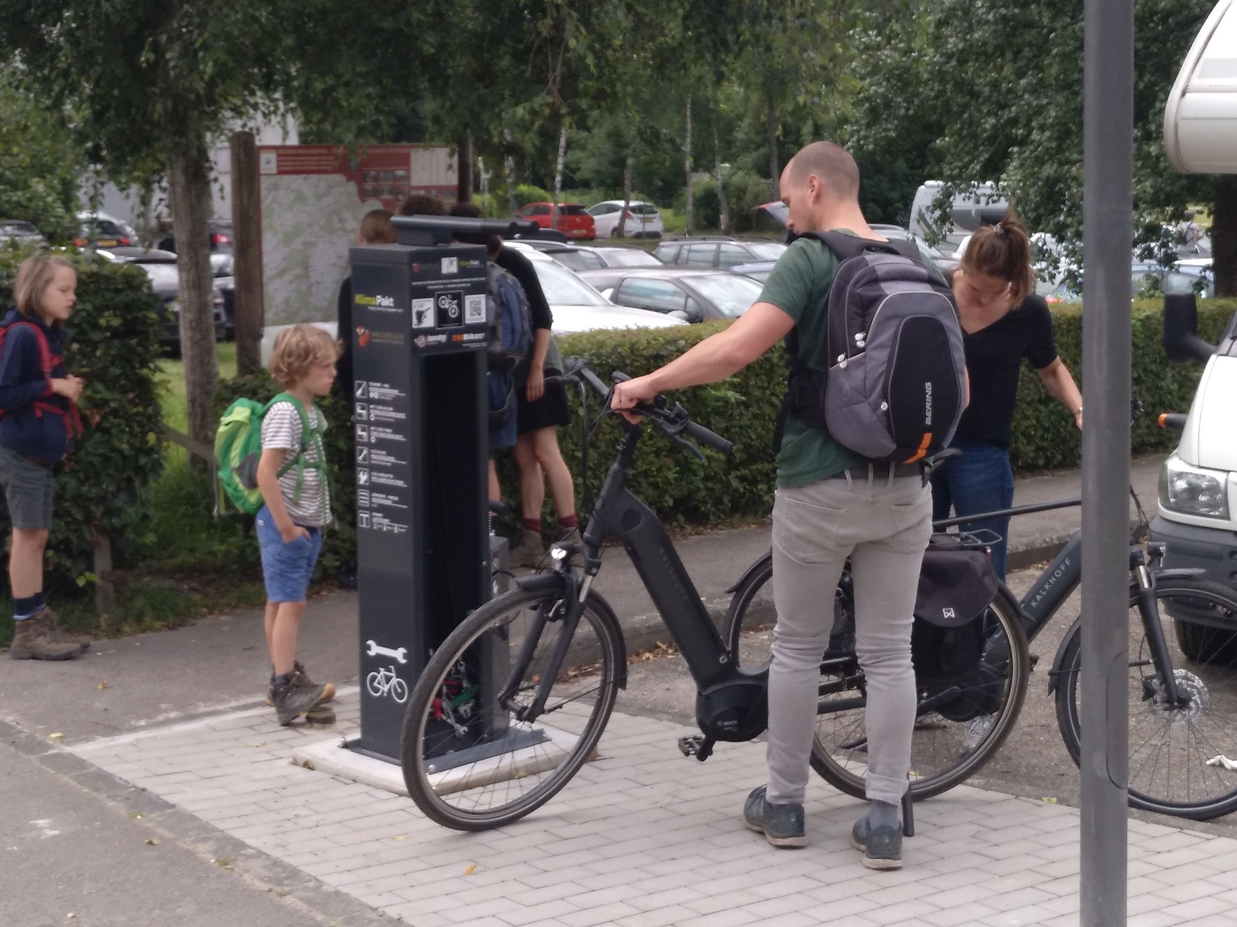 La station de réparation située à proximité du parking dans la localité de Mullerthal propose des outils pour réparer les vélos ainsi qu'une pompe à air pour gonfler les roues, les poussettes et les chaises roulantes.