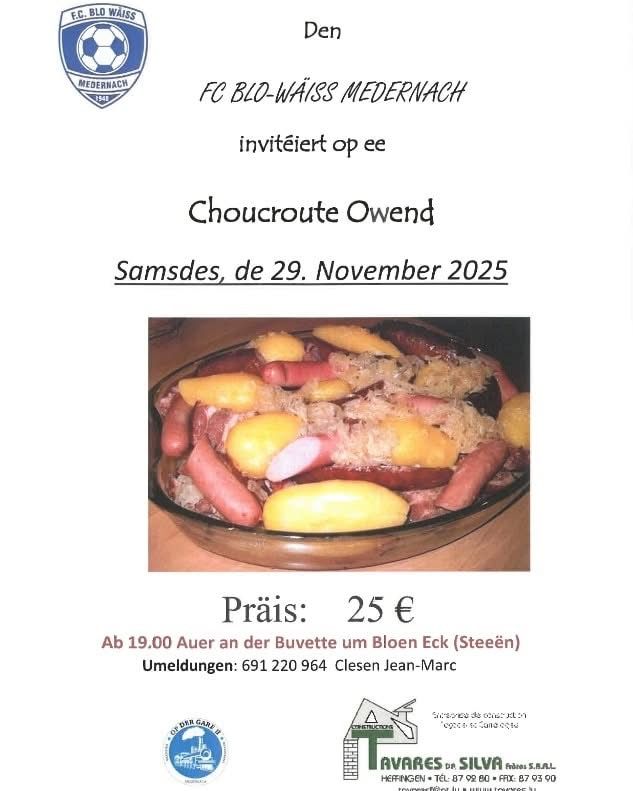 Soirée Choucroute organisée par le FC Blo-Wäiss Medernach dans leur Buvette à Stegen.