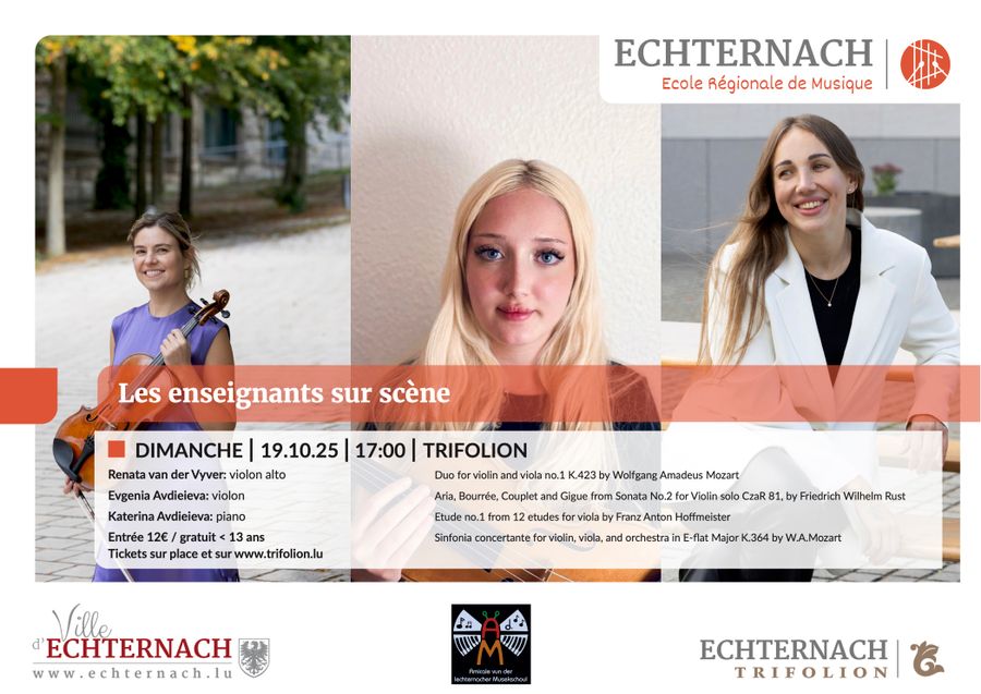 Katerina Avdieieva (piano) et Renata van der Vyver (alto), toutes deux professeures à l’école de musique d’Echternach, seront rejointes par la fille de Katerina, Evgenia Avdieieva (violon), pour interpréter des œuvres emblématiques de la période classique, du milieu à sa maturité. Les compositions de W.A. Mozart mettent particulièrement en valeur le magnifique dialogue qui peut exister entre le violon et l’alto, deux instruments remarquablement complémentaires lorsqu’ils sont confiés à un compositeur de génie. Le programme donnera également un coup de projecteur sur deux compositeurs moins connus mais tout aussi talentueux, F.W. Rust et F.A. Hoffmeister.