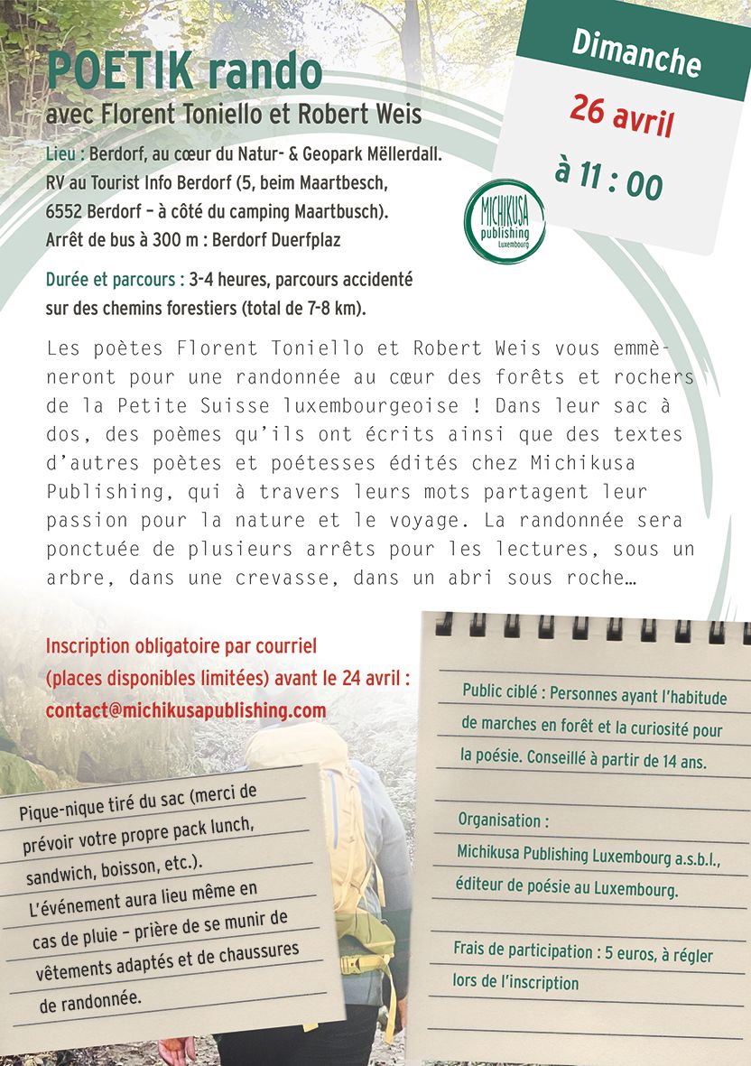 Les poètes Florent Toniello et Robert Weis vous emmèneront pour une randonnée au cœur des forêts et rochers de la Petite Suisse luxembourgeoise ! Dans leur sac à dos, des poèmes qu’ils ont écrits ainsi que des textes d’autres poètes et poétesses édités chez Michikusa Publishing, qui à travers leurs mots partagent leur passion pour la nature et le voyage. La randonnée sera ponctuée de plusieurs arrêts pour les lectures, sous un arbre, dans une crevasse, dans un abri sous roche…