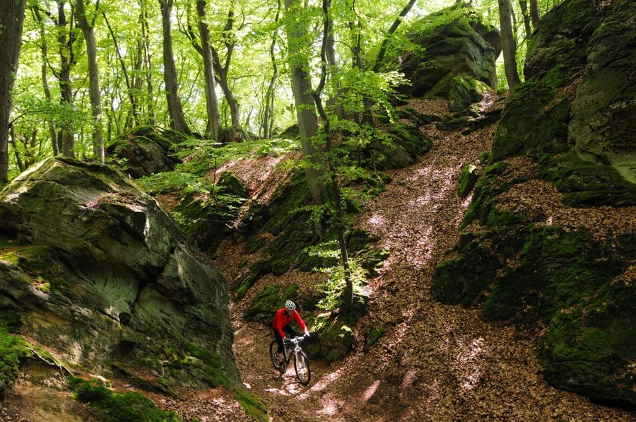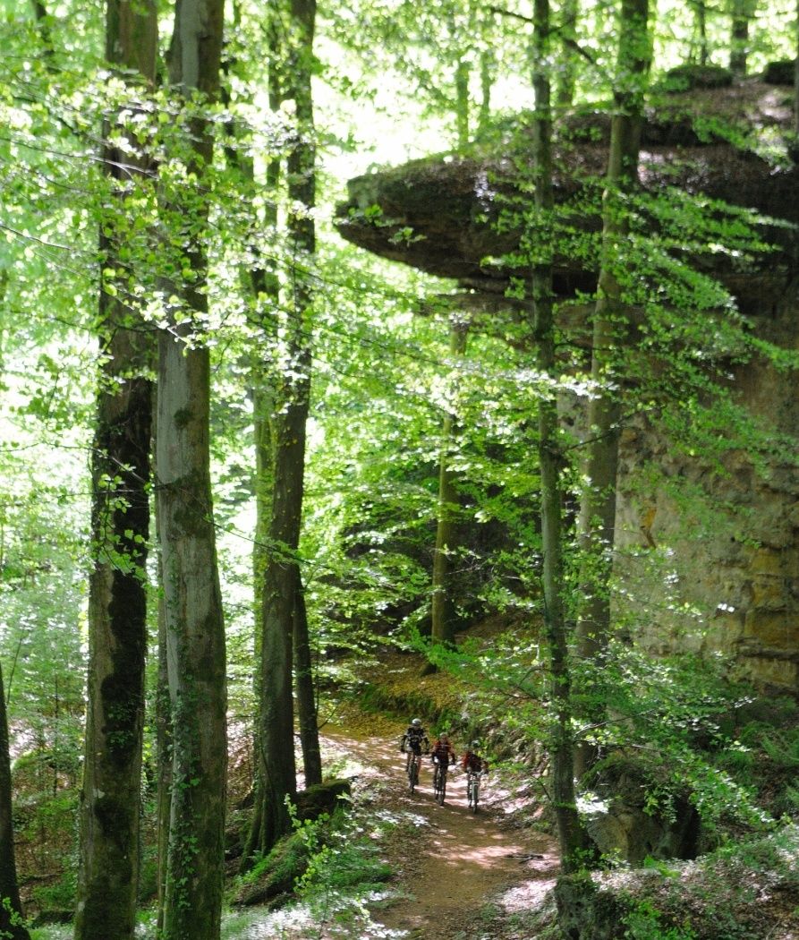 Le parcours de difficulté moyenne autour des hauts plateaux de Berdorf et Beaufort se déroule sur des sentiers à travers des mondes rocheux bizarres. Les montées et descentes sportives ainsi que les belles vues sur la vallée de la Sauer font battre plus fort le cœur des cyclistes.