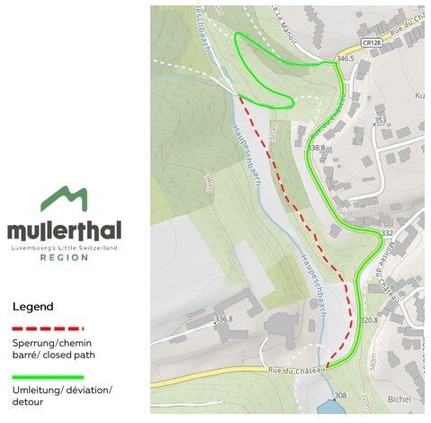 La première partie du parcours passe par le château via une passerelle jusqu'à Klingelbur (l'ancien lieu de lavage du château). Ensuite, le parcours continue en passant par Klaisgen (une petite chapelle située à 50 mètres à gauche du parcours) et le long des formations rocheuses du Birkbaach et de la Herkuleskapp. Le chemin longe ensuite le bord du plateau de Beaufort au-dessus de la réserve naturelle de Saueruecht, pour descendre près de Köppeglee dans la pittoresque vallée du Halerbaach et du Haupeschbaach, et enfin revenir au point de départ.