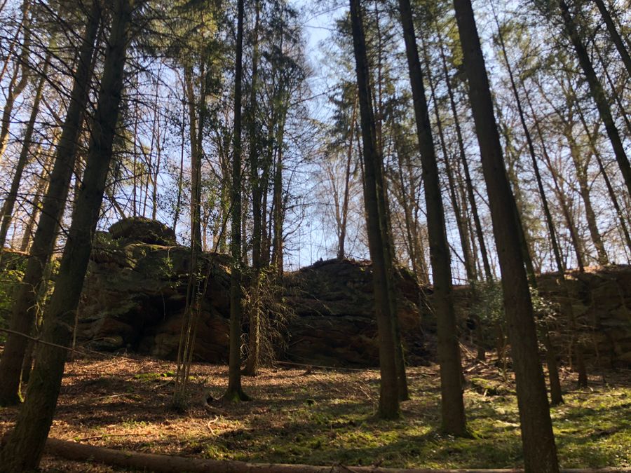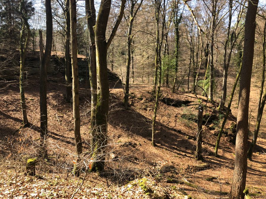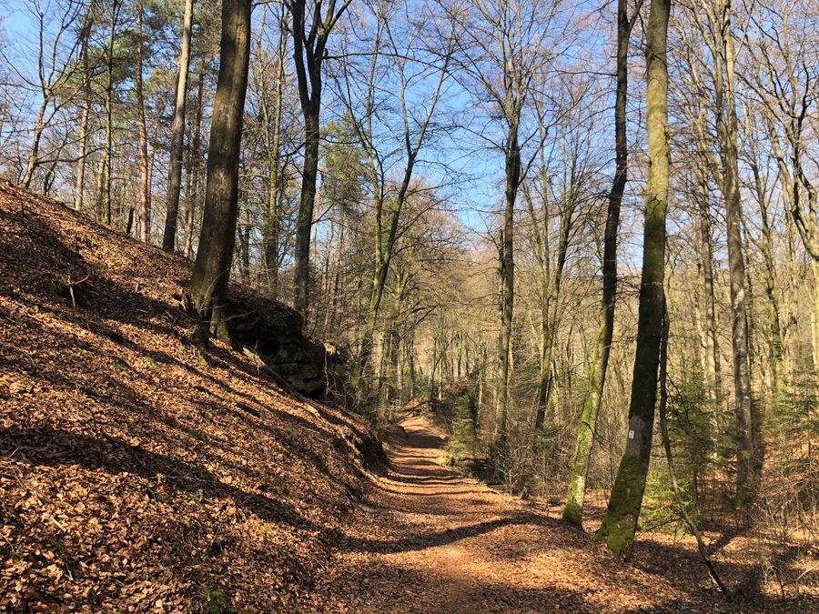 Ensuite, un ancien chemin creux traverse la forêt en montée. Le parcours serpente ensuite à nouveau vers la vallée, entouré de rochers. Par un chemin asphalté, on arrive aux étangs de Fischbach, qui offrent une possibilité de restauration.