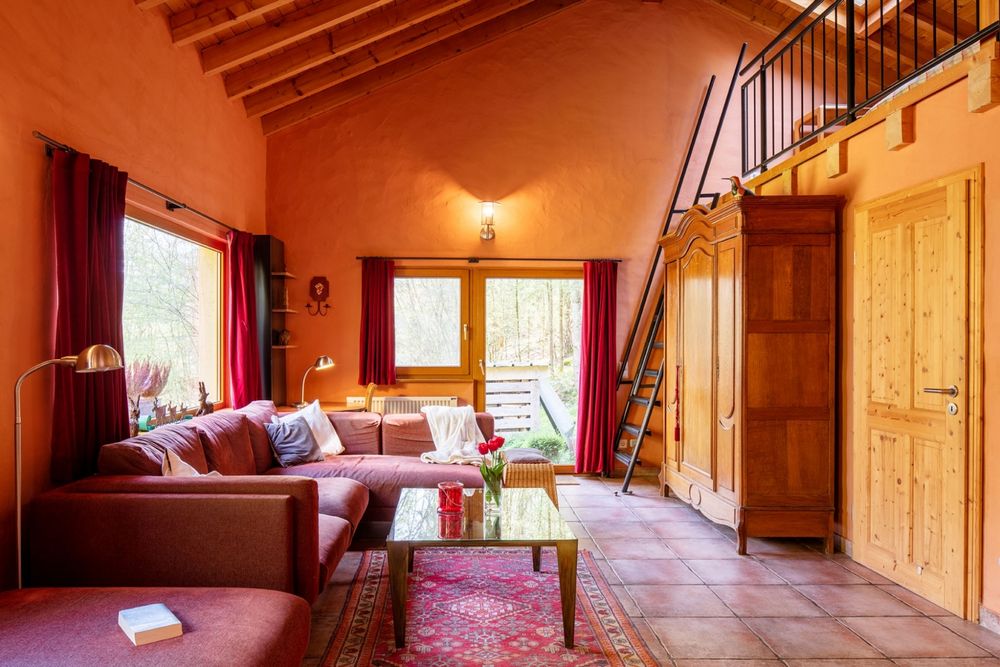 A small and barely driven road leads you up to the Villa Waldeslust. The house is located solitary in a small forest, near to the picturesque quaint village Bigelbach (1km distance). Beaufort, with its impressive castle ruin and its numerous hike paths, can be found in the immediate vicinity (3 km distance). The Villa is located in a nature-sanctuary. If you are lucky you can even watch deer or wild boars coming up to the house. The idyllic site in the heart of nature guarantees calm and rest. A private area of 60 acres including a spring, a fireplace, a BBQ place, two covered terraces and a big meadow with trees providing shade, belongs to the house.