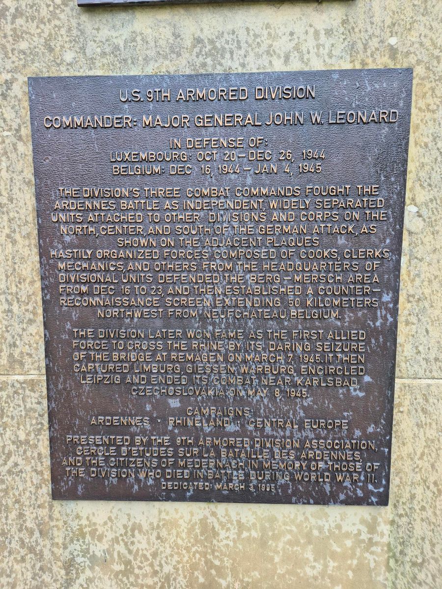 Het monument in Medernach herdenkt de inzet van de 9e Amerikaanse Pantserdivisie tijdens het Ardennenoffensief.