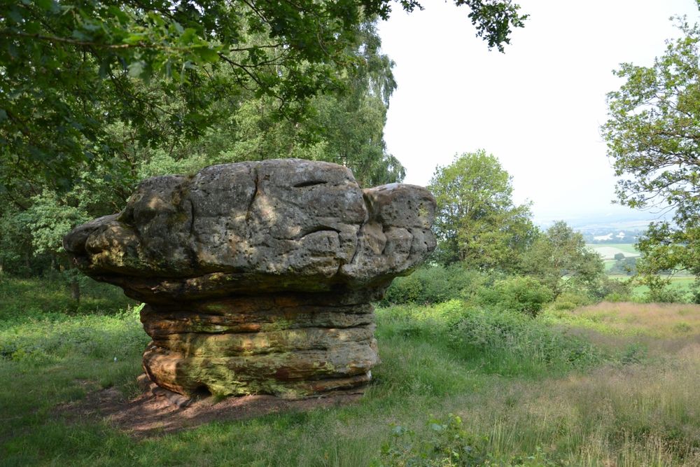Paddenstoelvormige rotsformatie met een bijzonder uitzicht op het heuvelachtige mergellandschap.