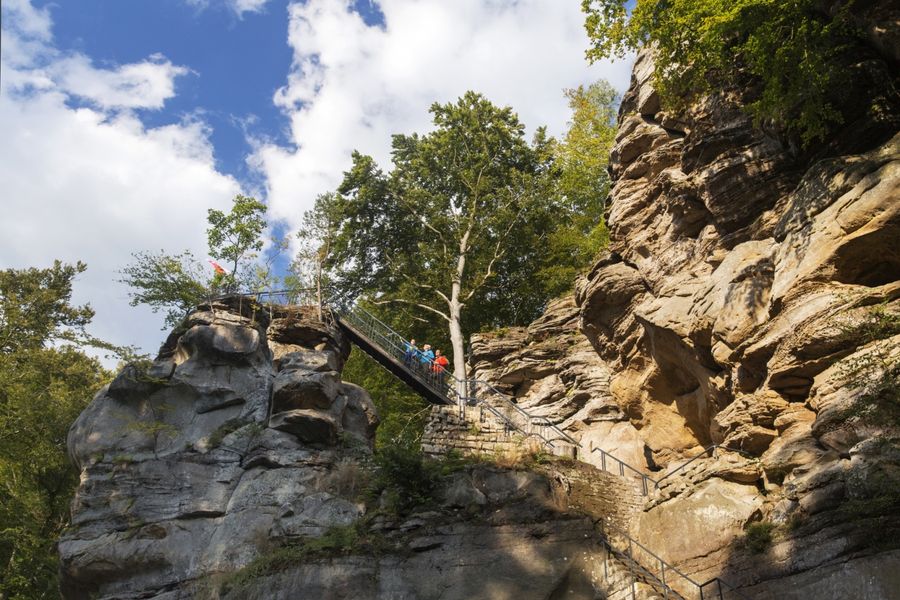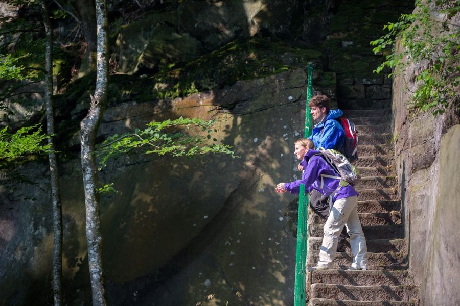 De indrukwekkende rots torent hoog boven de weg uit en biedt een indrukwekkend uitzicht over de regio Mullerthal.
