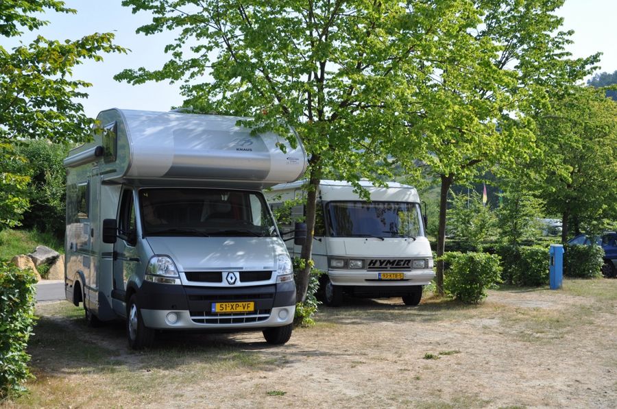 De staanplaatsen voor campers liggen voor de poort van de Europacamping Nommerlayen in de regio Mullerthal - Luxemburgs Klein Switzerland.