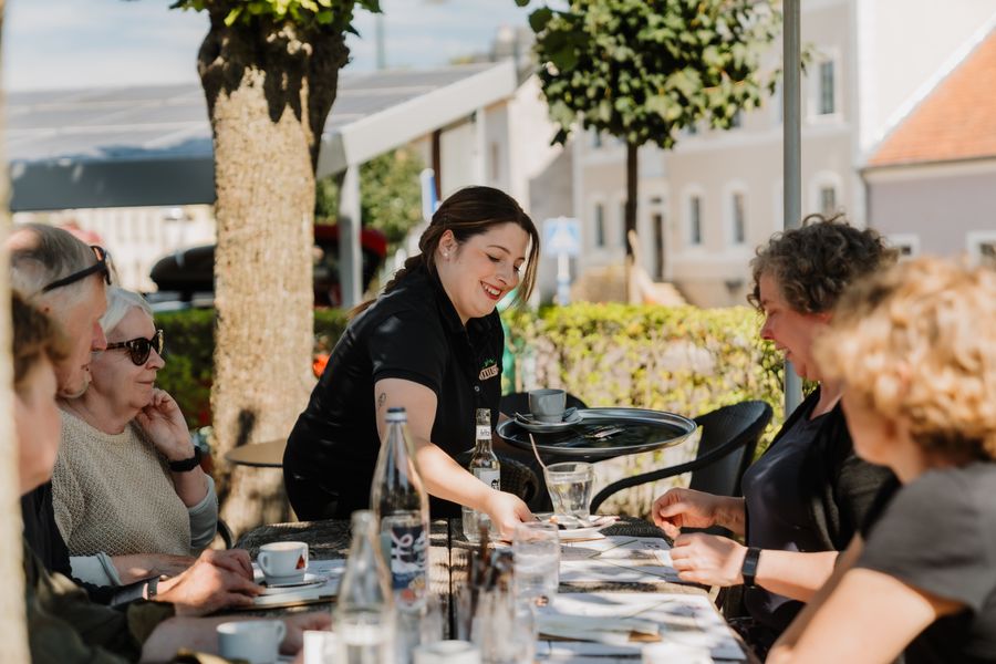 Schaduwrijke biertuin in de zomer, glühwein te koop in de winter.