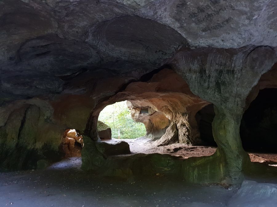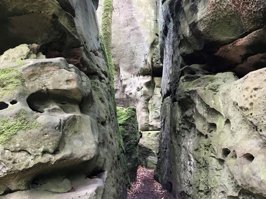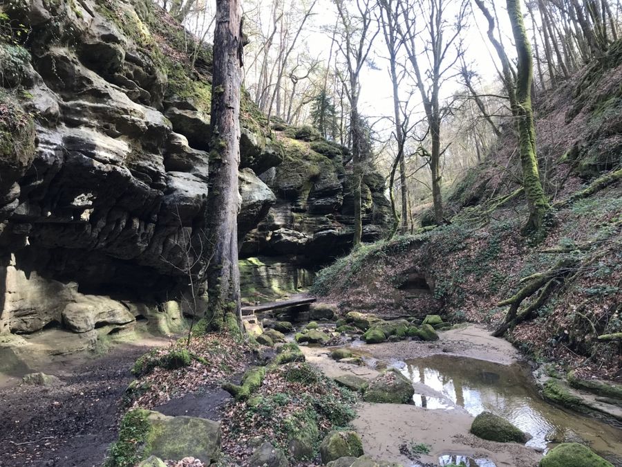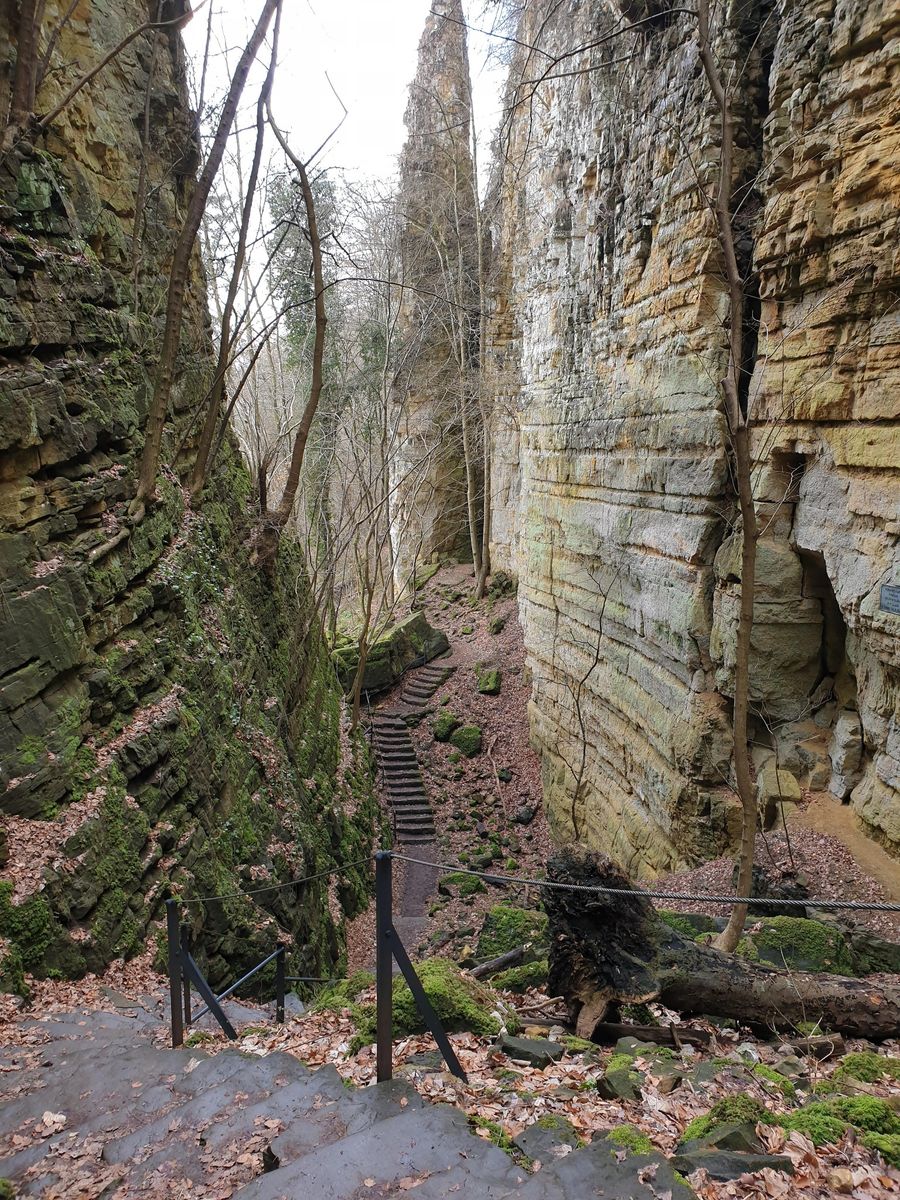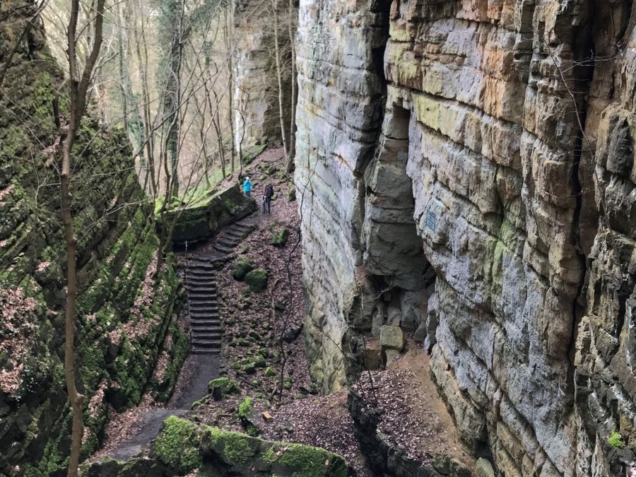 De Wolfsschlucht is een steile, gladde spleet waar het pad doorheen slingert.