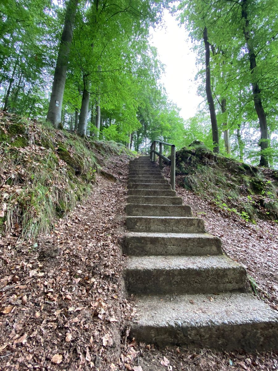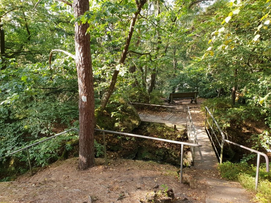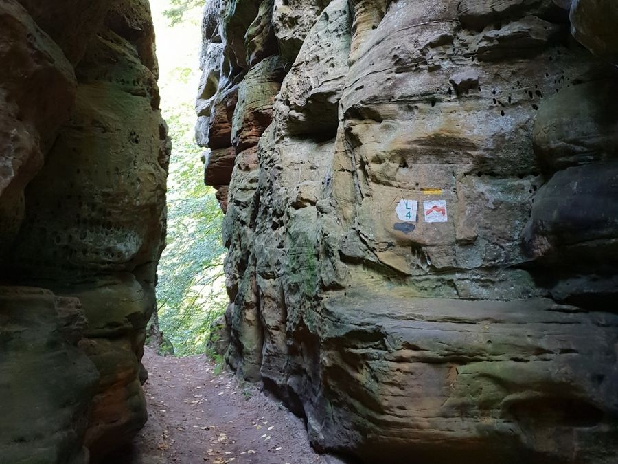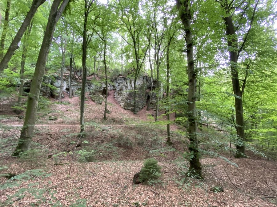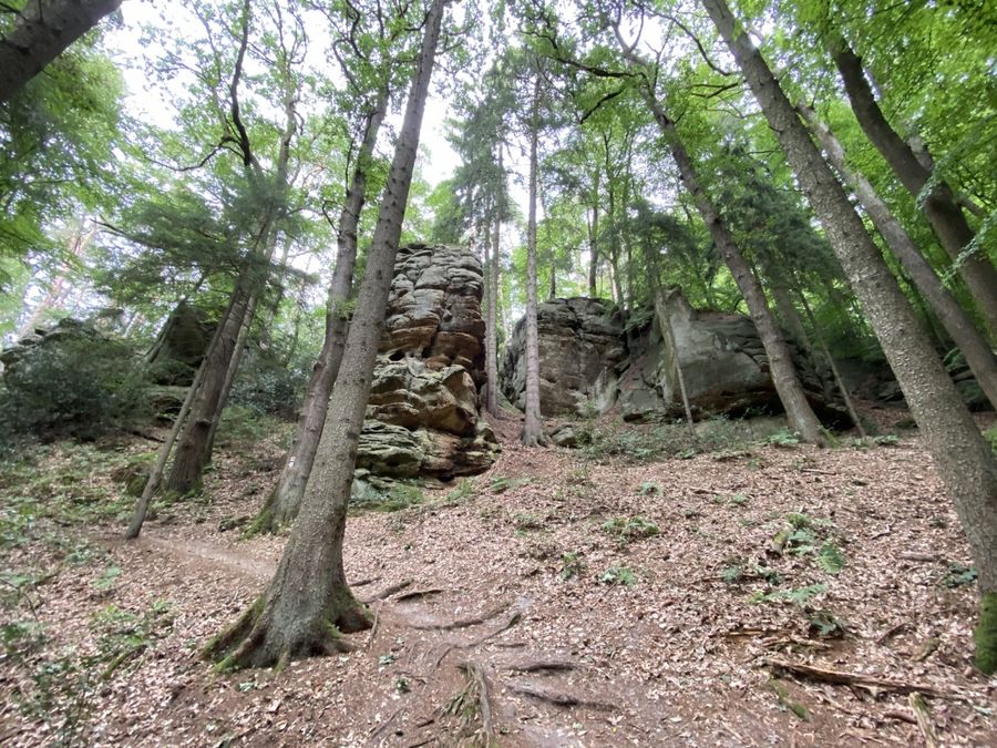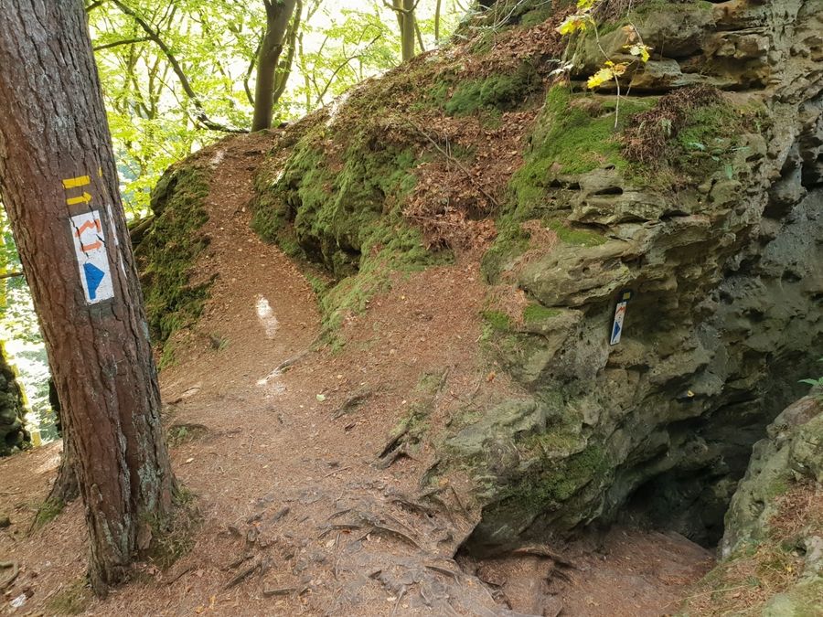 Vanaf het begin bij de Tourist Info leidt het pad naar de Gudelterhaff en verder naar de Noumerleeën. Deze indrukwekkende rotsformaties zijn kenmerkend van de Luxemburgse zandsteen uit de regio en tonen veel verschillende geologische structuren. De overblijfselen van een vluchtburcht, de Alebuerg, zijn hier te vinden, evenals sporen van houtverkolingsplekken. Vervolgens gaat het pad door het bos, de Knappbësch, langs een kapel naar de Heisgeskräiz, waarschijnlijk het oudste wegkruis in Luxemburg. Niet ver van het kasteel gaat de weg terug naar het startpunt.