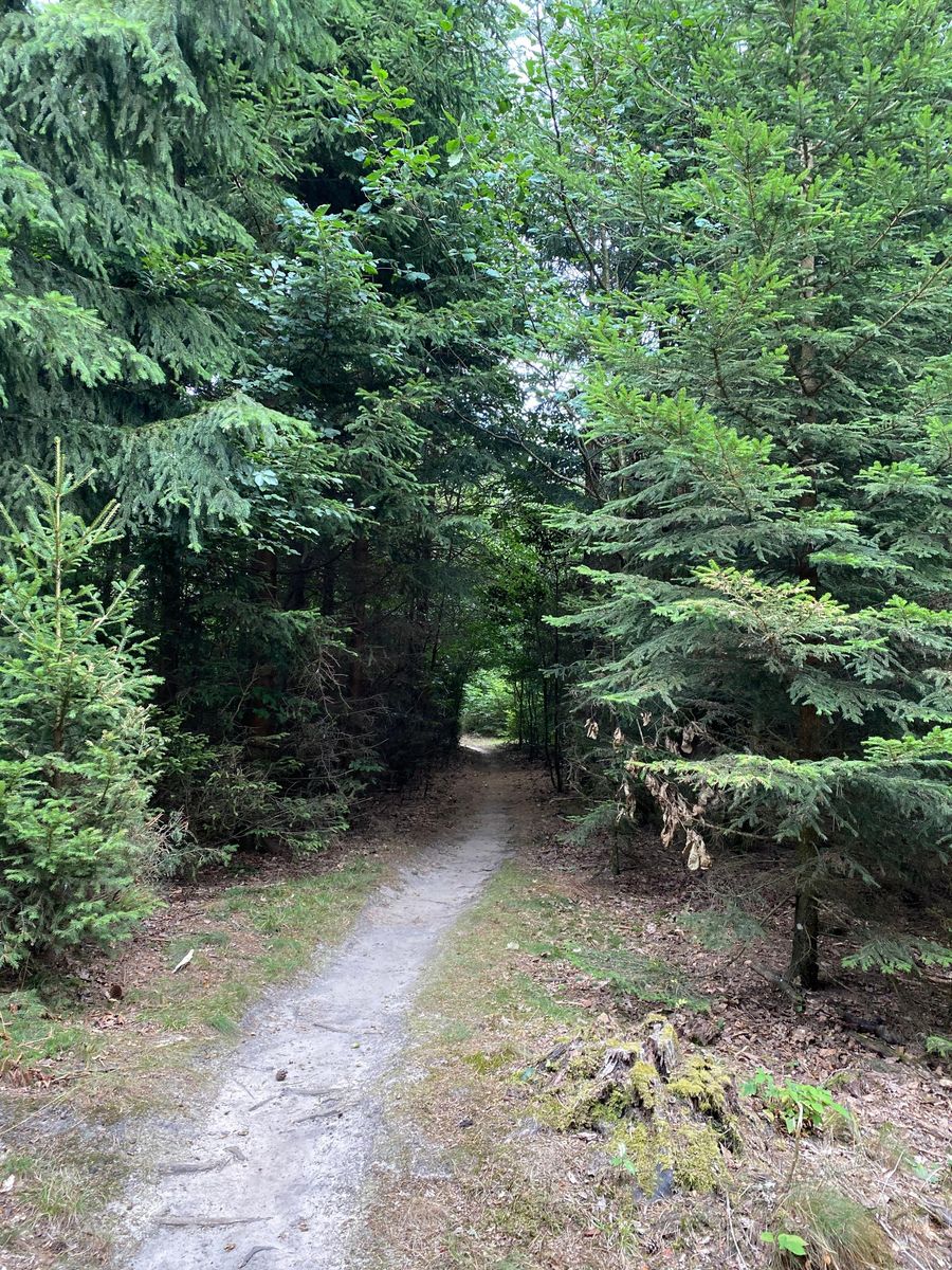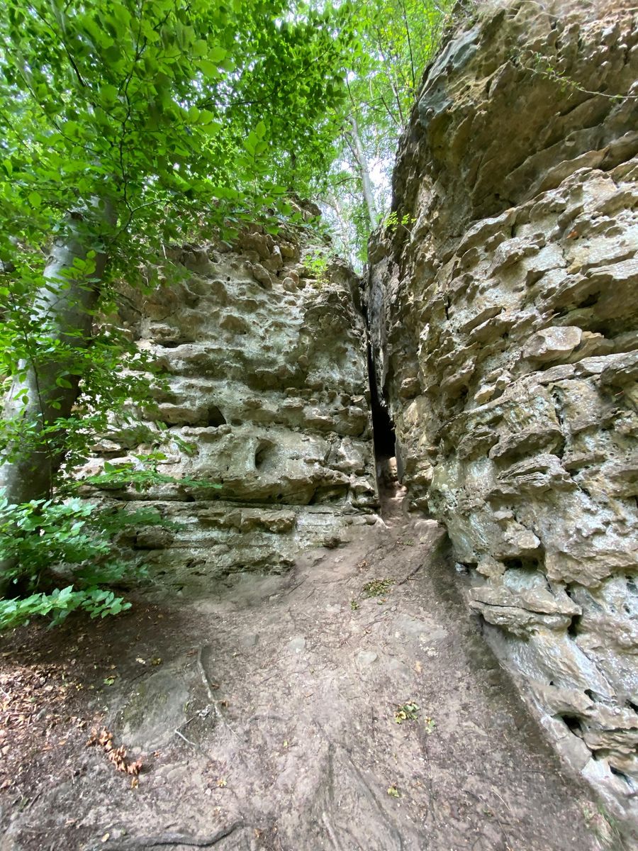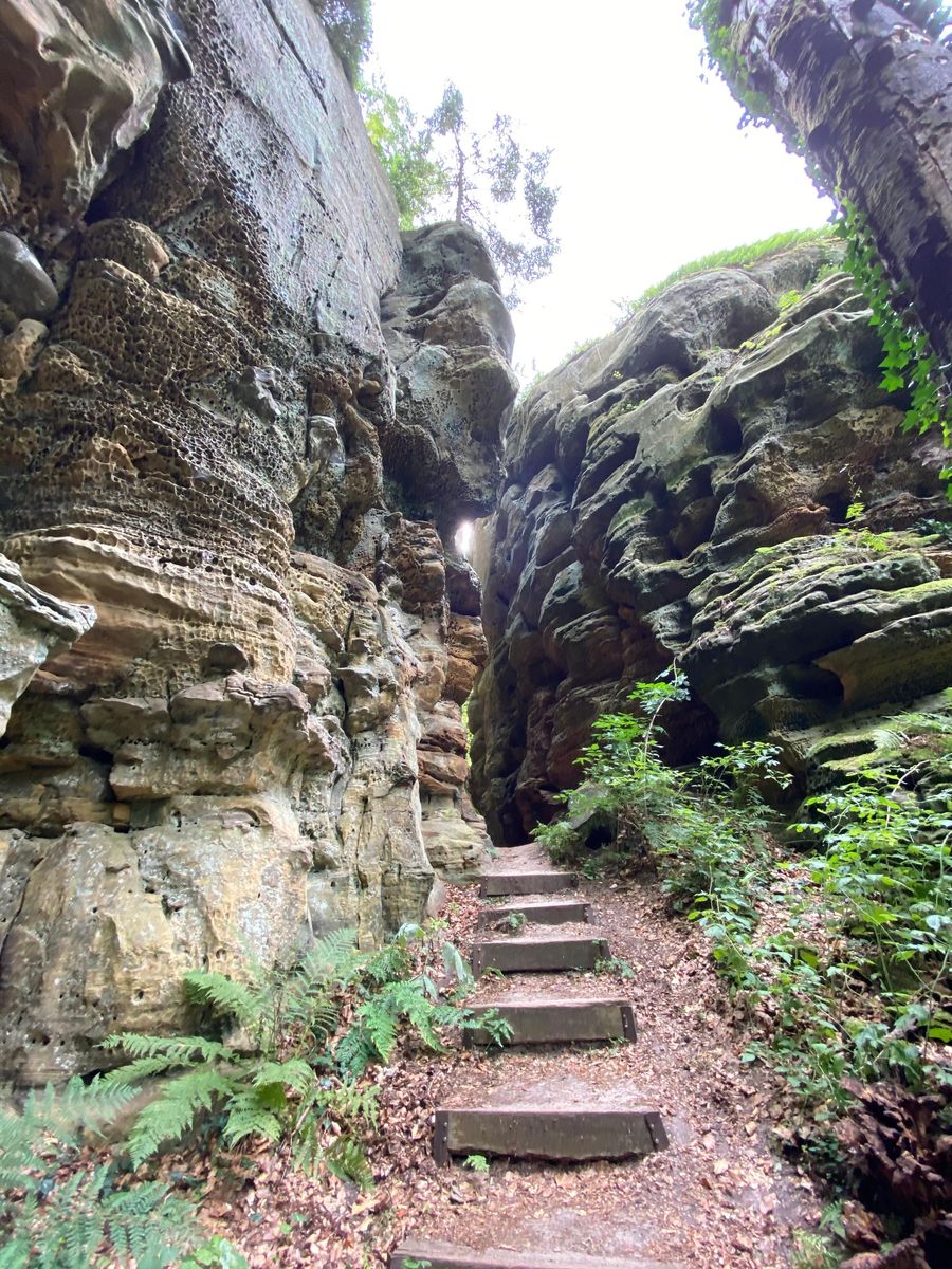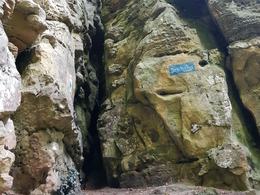 Vanaf het begin bij de Tourist Info leidt het pad naar de Gudelterhaff en verder naar de Noumerleeën. Deze indrukwekkende rotsformaties zijn kenmerkend van de Luxemburgse zandsteen uit de regio en tonen veel verschillende geologische structuren. De overblijfselen van een vluchtburcht, de Alebuerg, zijn hier te vinden, evenals sporen van houtverkolingsplekken. Vervolgens gaat het pad door het bos, de Knappbësch, langs een kapel naar de Heisgeskräiz, waarschijnlijk het oudste wegkruis in Luxemburg. Niet ver van het kasteel gaat de weg terug naar het startpunt.