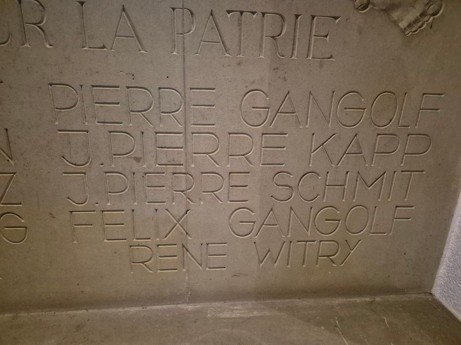Beneath a relief of a Pietà and the inscription ‘Morts pour la patrie’ (Died for the Fatherland) are the names of those who were forcibly recruited or in concentration camps and did not survive the war: