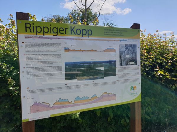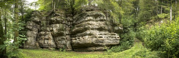 Covered with moss, lichens and ferns, the "Gefale Leeën" - "fallen rocks" - line the path. The rocks are made of dolomite and have fallen from the great rock face. Water trickles through crevices in the dolomite and accumulates on the underlying marls, a clay-rich rock. For a long time, the rock faces of the dolomite slip down on the softened marls to the valley. Huge rock falls such as the "Gefale Leeën" can occur on the Dolomite rock walls, but they are rare. They are usually favoured by intense erosion of the slope by the Sûre. On the unsteady relief around the partially overgrown stone blocks, a canyon forest has developed. A canyon forest of linden, maple, beech and elm trees grows on steep slopes where the top layer of soil and rock is not stable.
