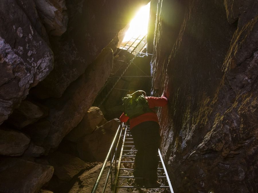 Enter one of the narrowest caves in the region and climb out again via the stairs.