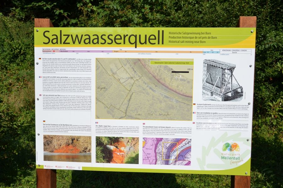 In the area of the Born anticlinal fold, the groundwater horizon in the red sandstone has a higher level than the Sûre river, so that springs emerge. When the Sûre is low in water a source becomes visible whose water has a high salt and iron concentration. This water was used from the 16th (1587) to the middle of the 18th century (1749) for salt extraction by grading. Grading means that the salinity of the water from such a source is increased because the water evaporates naturally by wind and sun. Thus, heating energy is saved for the subsequent boiling of the brine. In the middle of the 18th century, the saline plant was shut down. Reasons for this could have been the emerging lower degree of saturation of the source on the one hand or political reasons on the other. According to legend, even today the little salt man appears at the spring around midnight and frightens passing hikers. Those who misappropriate foreign property are particularly tormented by the salt man.