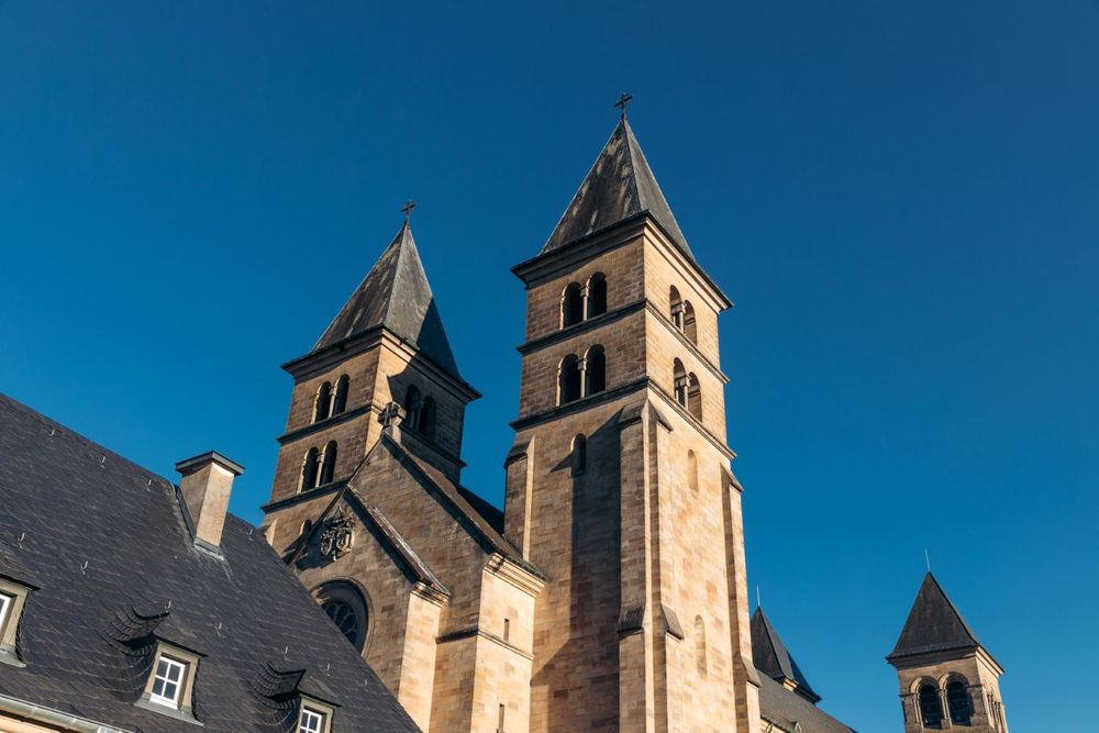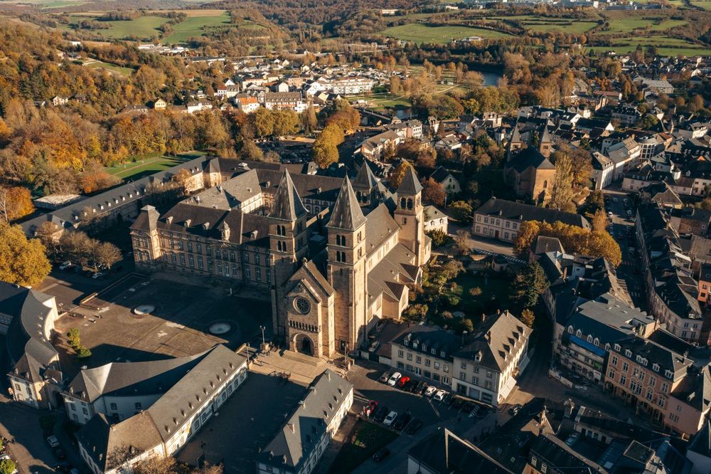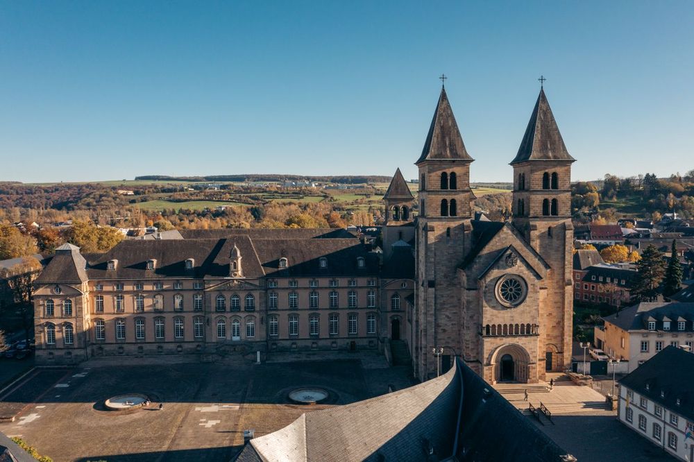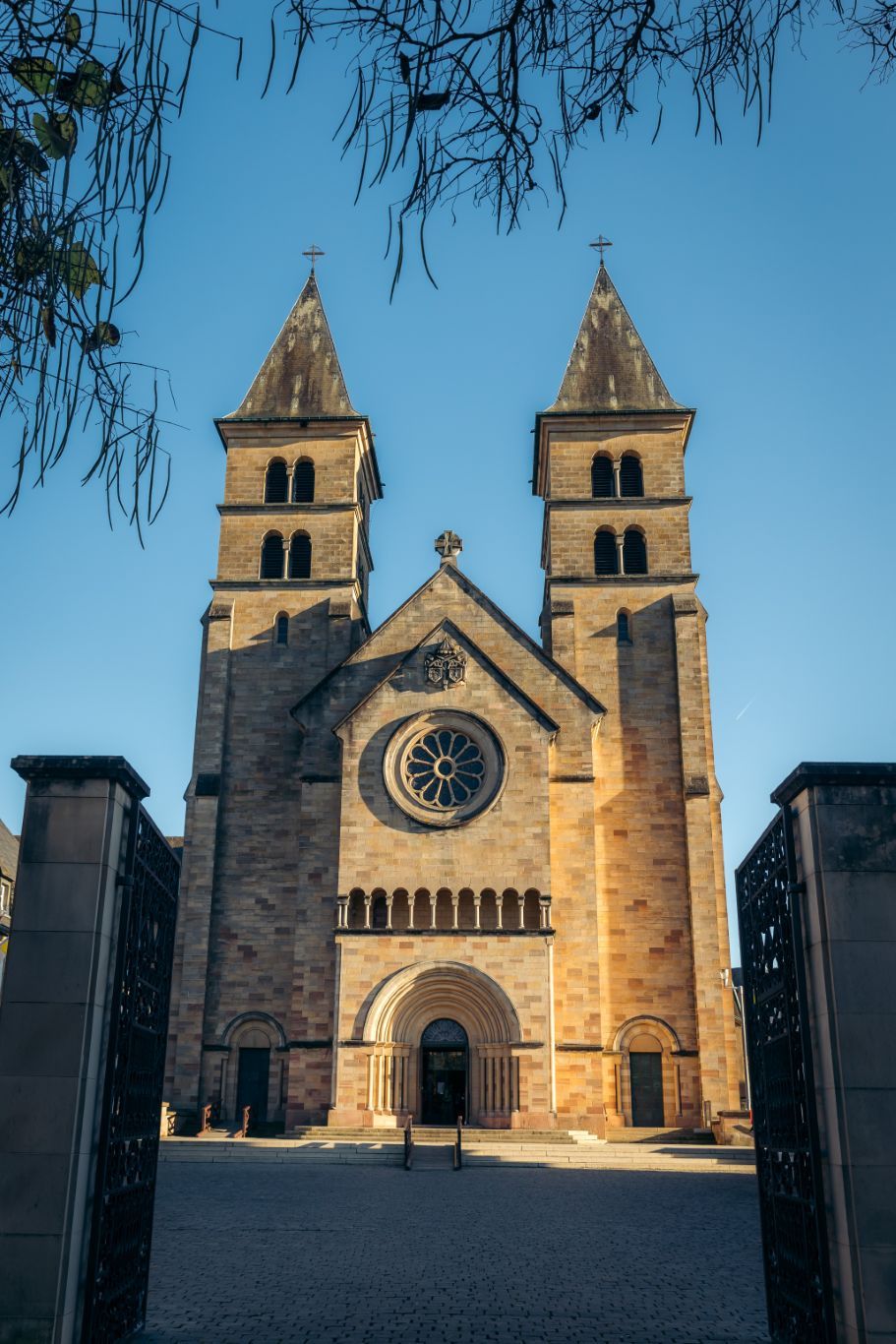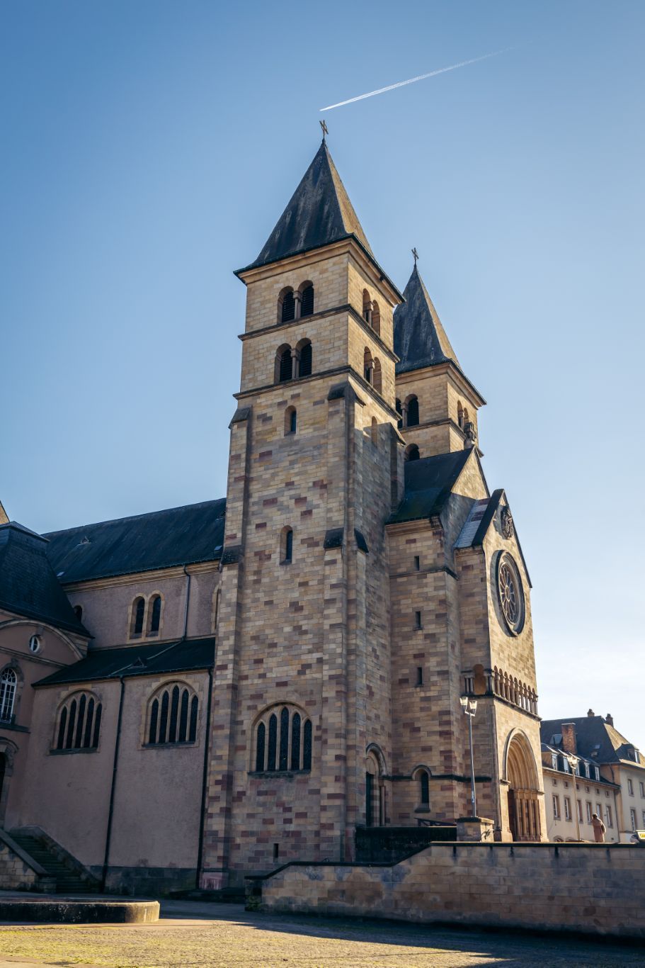The Merovingian crypt contains a magnificent white marble sarcophagus in which are the remains of the founder of the abbey of Echternach. 11th century frescoes. The papal basilica, whose present design dates from the 11th and 13th centuries, was seriously damaged during the Battle of the Bulge, and it was rebuilt in Romanesque Revival style. The crypt dates from the Merovingian period and has magnificent frescoes. It houses a sumptuous white marble sarcophagus, containing the mortal remains of Saint Willibrord. Other sights are the St. Willibrord fountain and the Renaissance confessionals.
