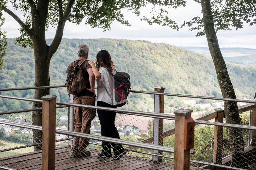 The hike starts right in the middle of Echternach's old town, at the basilica. The first ascent of the route is challenging and is rewarded with a spectacular view over Echternach from the so-called Trooskneepchen. The path continues through the forest to the impressive rock formation "Wollefsschlucht". You should allow enough time here to admire and explore. After crossing the Wollefsschlucht coming from Echternach, you can climb to the Paulsplatte to the left or to the "Bildcheslee" viewpoint on the right with views into the Sauer valley.
