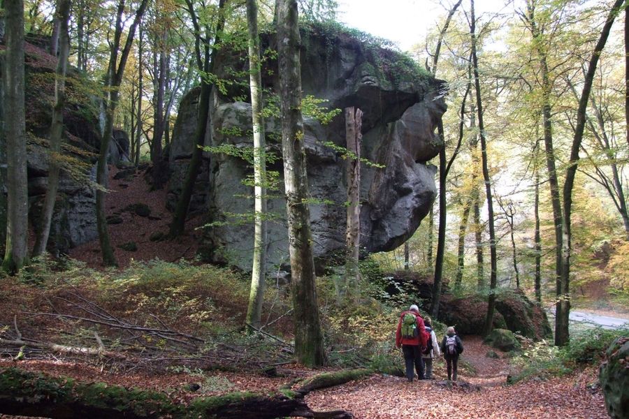 The hiking trail first leads across the plateau of Berdorf, along fields and offers wonderful views over the landscape in good weather. Then it goes down into the rock landscape. After a detour along the Halsbaach, past places with evocative names like "Wëllkeschkummer" and "Zigeinerlee" the path continues down into the valley of the Aesbaach. There awaits a geological highlight: the Perekop. A rock that you can climb up via a ladder.