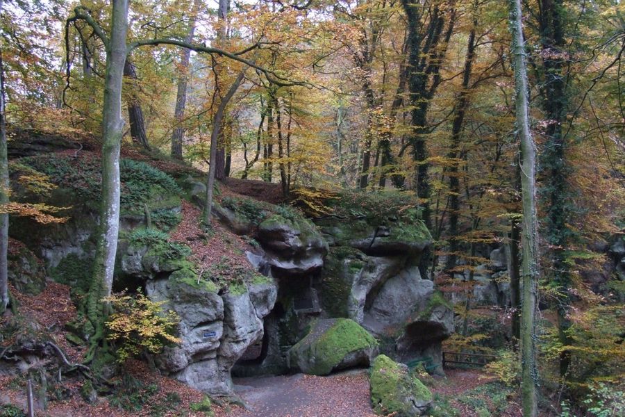 It continues on the Mullerthal Trail through the enchanting rock landscape to the "Huel Lee", a man-made cave. An information board provides details about its formation.