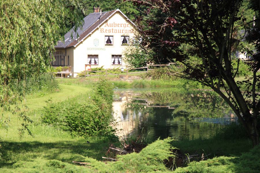 After crossing the area of a former refuge castle - today a campsite, football field, and playground - the hiking trail leads to the westernmost extension. From here, a rewarding view over rugged rock walls offers a picturesque view of the Bering of the Konsdrefer Millen (Consdorf Mill) situated in the valley. Tricky stair steps through a narrow rock crevice lead down into the valley of the Konsdrefer Baach (Consdorf Creek). After crossing the Fluedebuer parking lot and the main road, the forest path leads a short distance upstream along the Härdbaach. Via a narrow path, the height meters previously descended must now be climbed again, past a small spring popularly called Nidderbierchen or Nidderbierchelchen (little fountain).