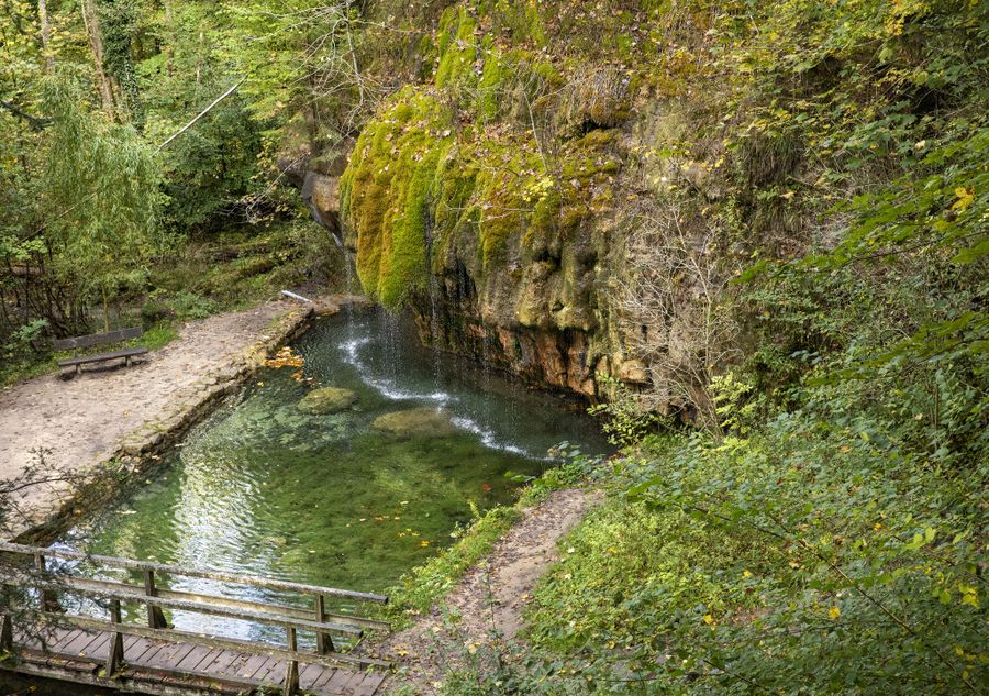 Back in Dickweiler, you drive through Herborn and Bech towards Consdorf, where you turn left towards Mullerthal and immerse into the rocks. At Breidweiler-Pont, turn left through the beautiful valley of the Ernz Noire towards Junglinster. After almost 1 km, you see the wooden pier and the travertine source on your left. You can leave your car at the end of the pier.