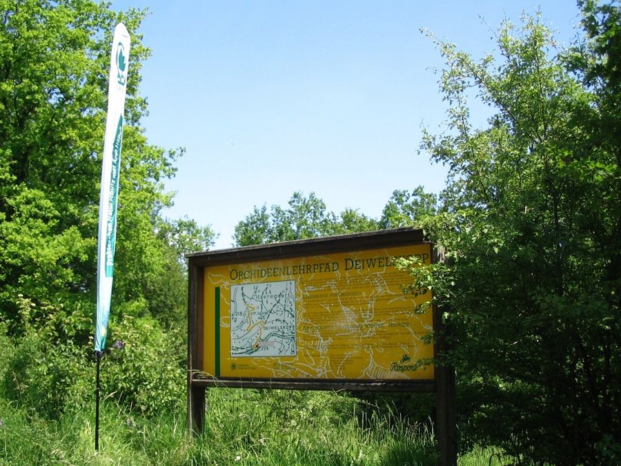 The hiking trail starts at the school and sports complex near the village of Born. At the beginning of the path is a geological barefoot trail "Salzmännchegaart". The ascent to Wangertbierg is rewarded with wide views over the village of Born and the Sauer valley. Then the path leads along regionally typical orchards and dry stone walls into a forest area. The path passes rocks and dry grassland above the village of Moersdorf. Here the path runs together with the orchid nature trail of the Fondatioun "Hellef Fir D ́-Natur". Then it goes back down to Born.