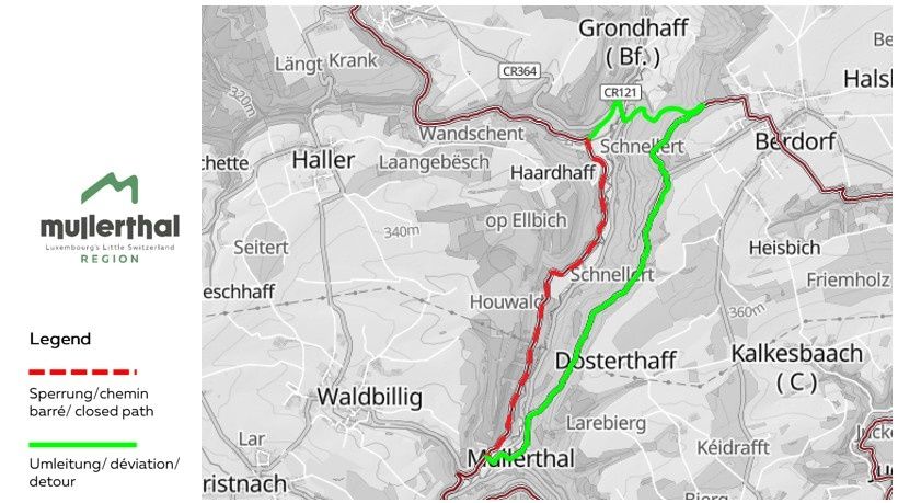 The approximately 112 km long Mullerthal Trail consists of three loops (Route 1, Route 2 and Route 3).